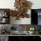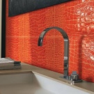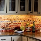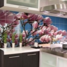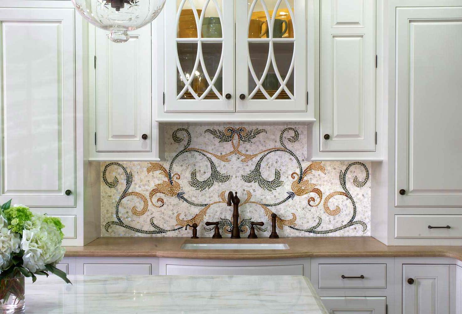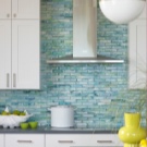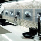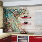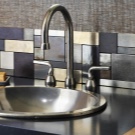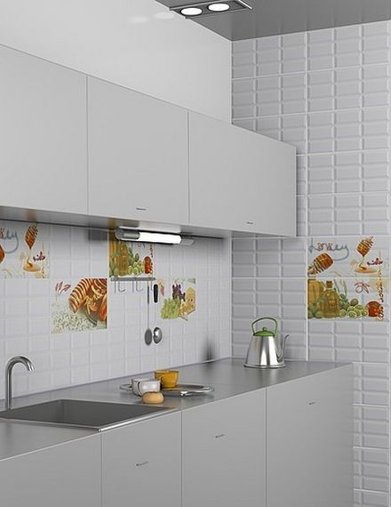 Eine an einer Mosaikwand angelegte Platte wird sehr originell und fett aussehen. Zur gleichen Zeit, wie die Designer bemerken, ist das Mosaik gut mit einer monochromatischen Fliese von einer Konsonantenfarbe gewöhnlicher Größe kombiniert. Eine Alternative für Fliesenplatten können spezielle Vinylaufkleber für Fliesen sein. Dieses Accessoire wird sehr eindrucksvoll aussehen und verschiedene Defekte überdecken können: Späne oder Kratzer auf der Fliesenoberfläche.