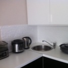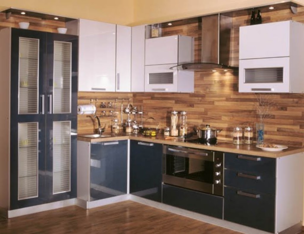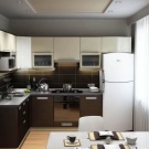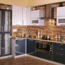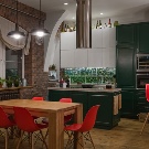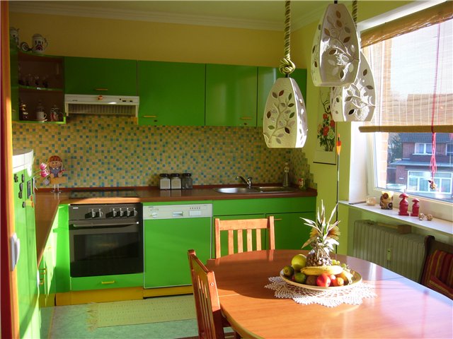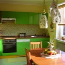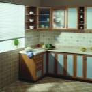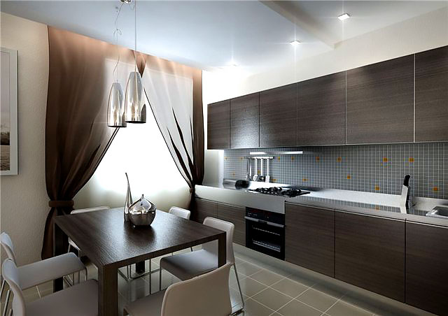 Auch wenn Sie die Küche entwerfen, sollten Sie nicht mehr als drei Grundfarben verwenden. Wenn es den Wunsch gibt, den Raum visuell zu erweitern, dann lohnt es sich, eine Wand aus hellen Farbtönen zu verwenden, um den Wänden gegenüberzutreten. Neben der Farbe muss auch die Größe der Beschichtung berücksichtigt werden: Eine große Fliese reduziert optisch den Raum, eine kleine Fliese dehnt sie aus.