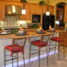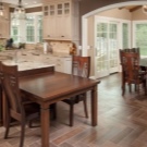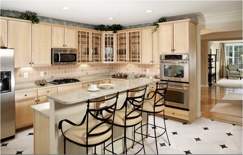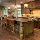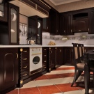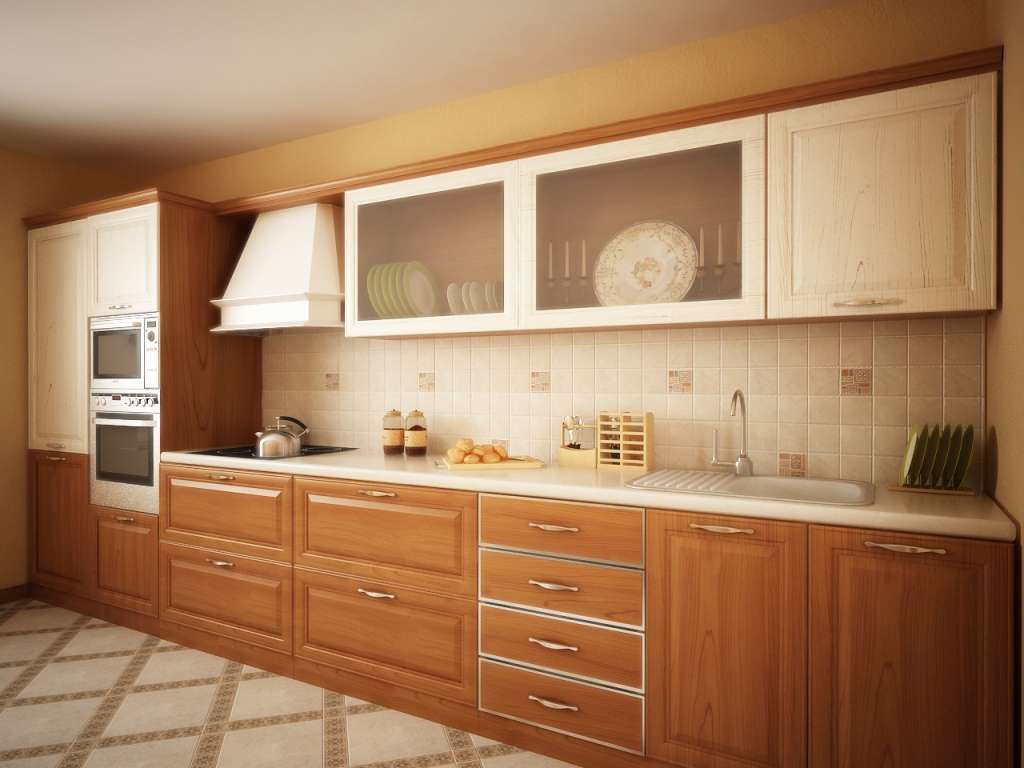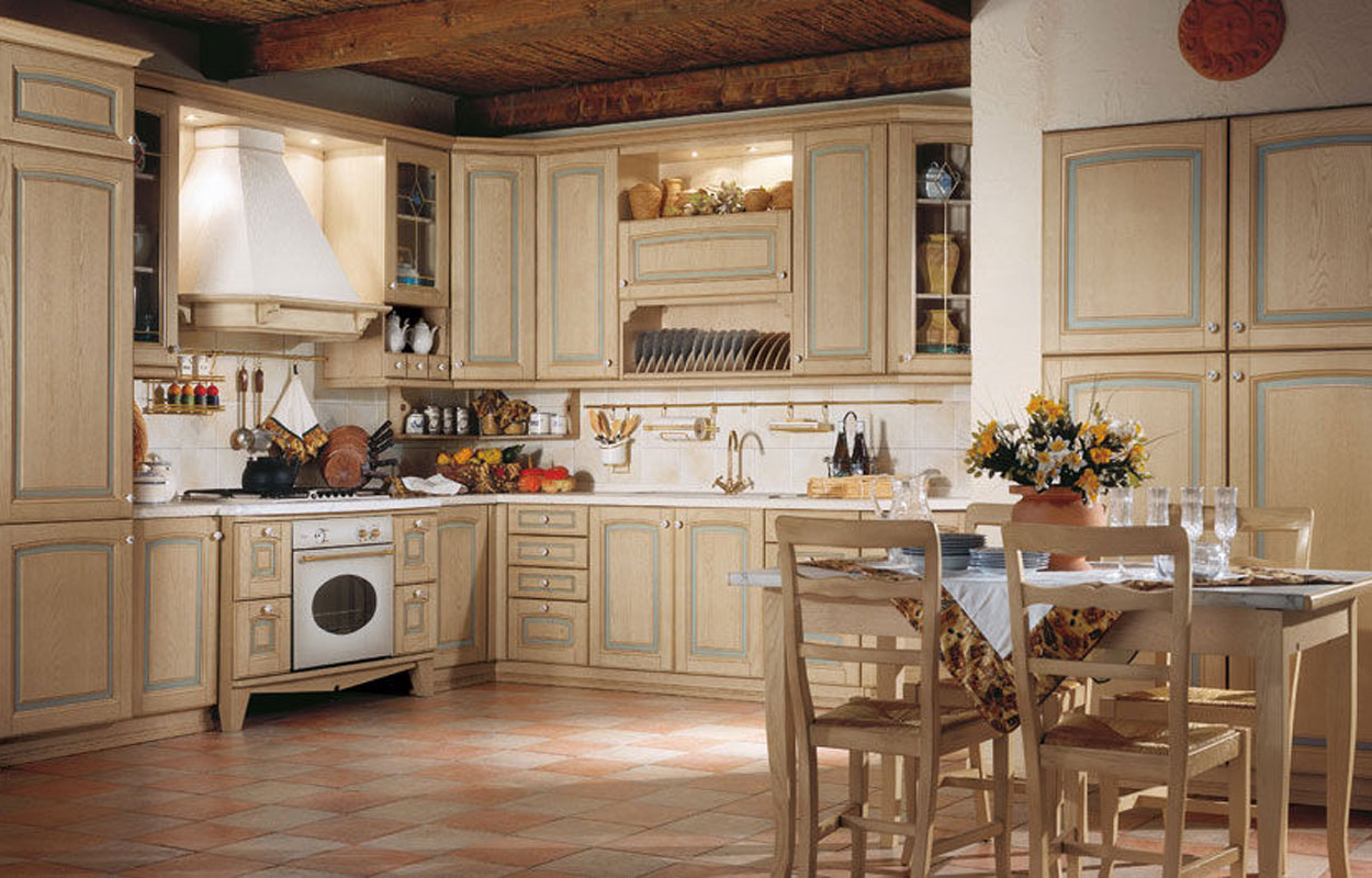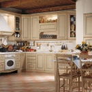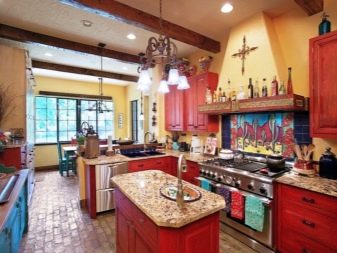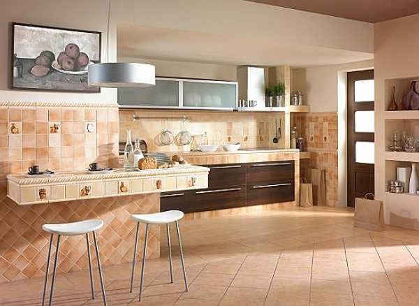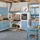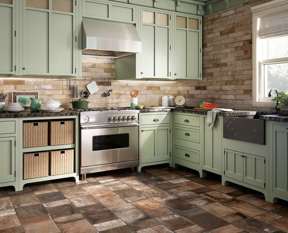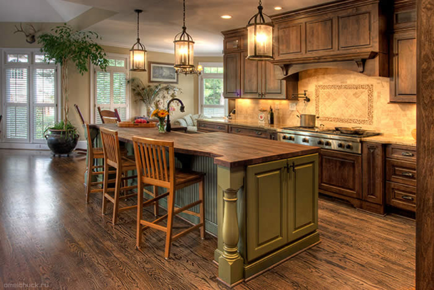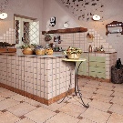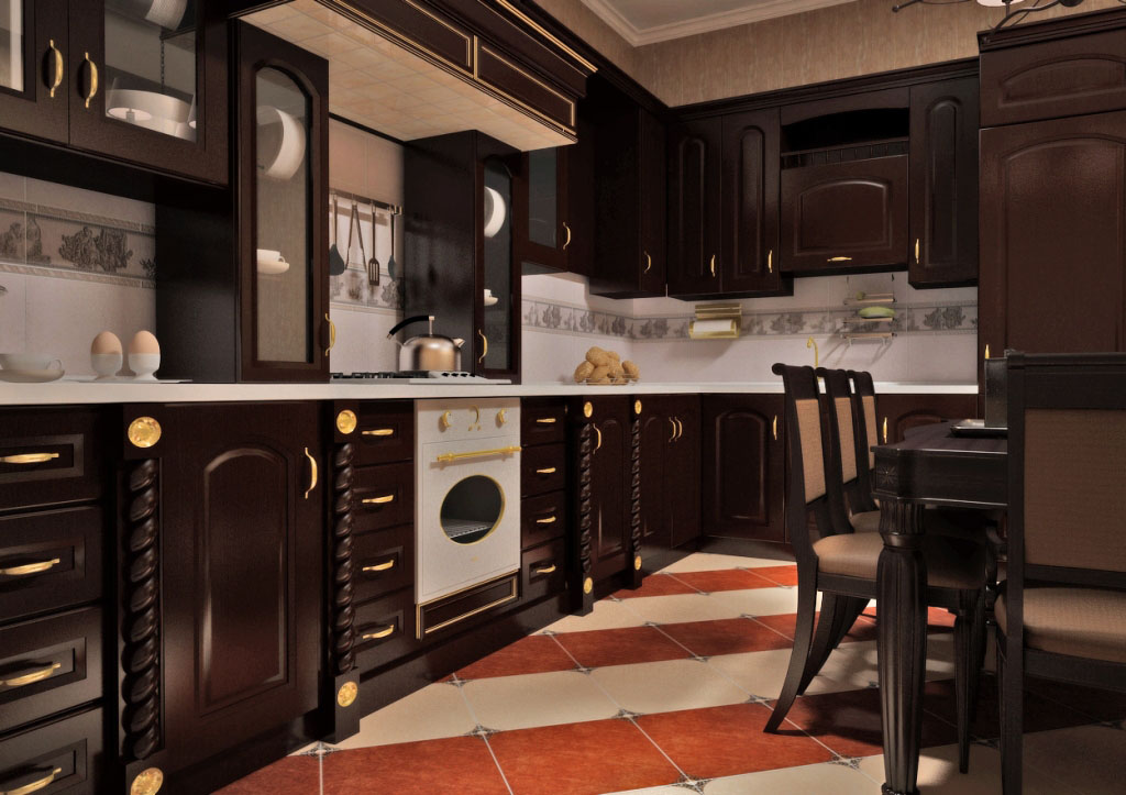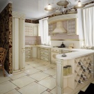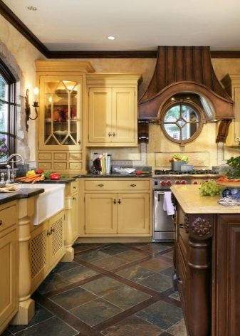 Sehr relevante Innenräume, im Stil dekoriert. Country-Musik. Um diesen Stil zu schaffen, verwenden sie in der Regel beige-goldene, dunkelbraune Materialien, die natürliche Steine und antike Ornamente nachbilden. In diesem Fall sollte auf dem Boden künstlich gealterte Fliese gelegt werden. Für das Design der Schürze können Sie ein Muster aus kleinen Stein mit Unregelmäßigkeiten wählen. Und auf dem Boden kann ein Bild von einer Vielzahl von natürlichen Motiven sein.