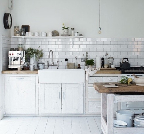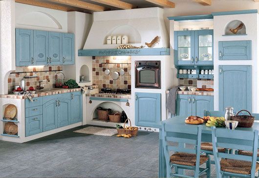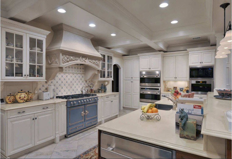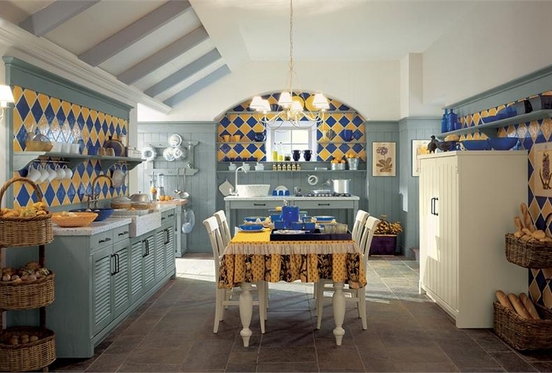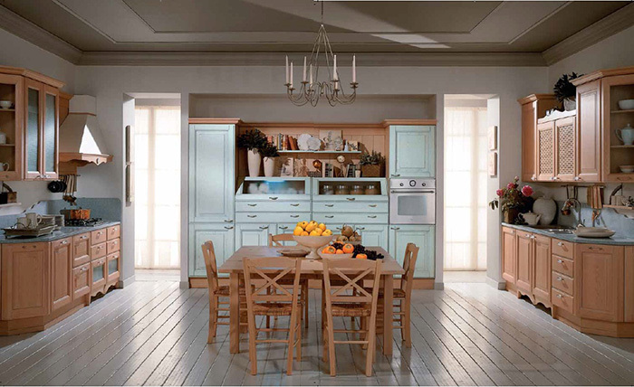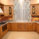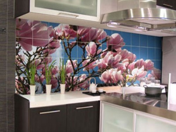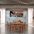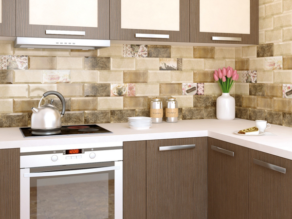 Für das Design der Küche im provenzalischen Stil passen Fliesen in Pastelltönen oder Fliesen. Auf der Arbeitswand wird die Zeichnung von schlichten Blumen, wie Tulpen und Laub, angebracht sein.
