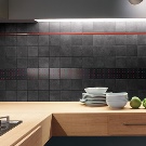 Ein weiterer sehr modischer Stil - High-Tech, die sich durch Minimalismus im Design auszeichnet. Daher soll die Fliese dunkle Farben aufgreifen und ihr Design auf ein Minimum reduzieren. Schwarz, Grau und eine Farbe, die Metall nachahmt.
