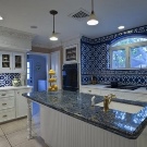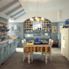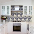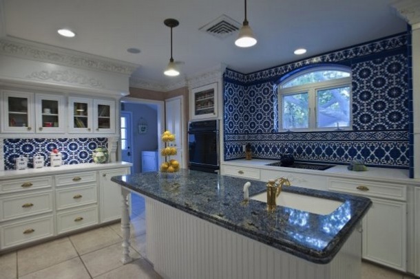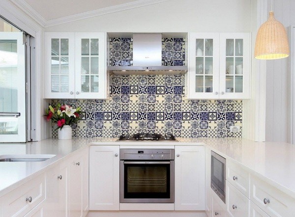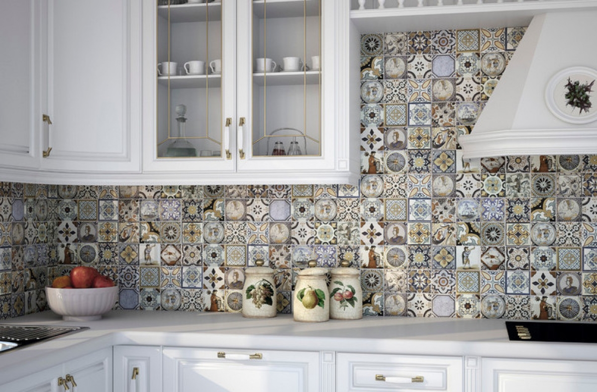Für die Ausführungsform mediterranes Interieur geeignet Mosaik gesättigt blau oder gelbgrün. Es werden auch gut bemalte Fliesen oder Fliesen sein, die Natursteine nachahmen.