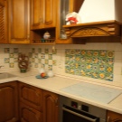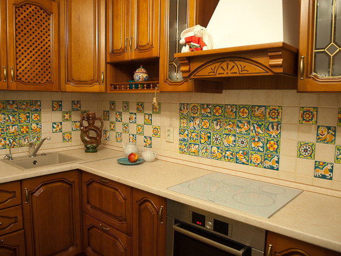 - Majolika - eine kleine Kachel, aus gebranntem Ton, mit Malereien verziert. Es verderbt nicht durch die negativen Temperatureffekte und die Feuchtigkeit. Dieses Material ist jedoch nur für die Dekoration von Wänden und Schürze geeignet.