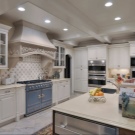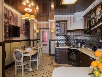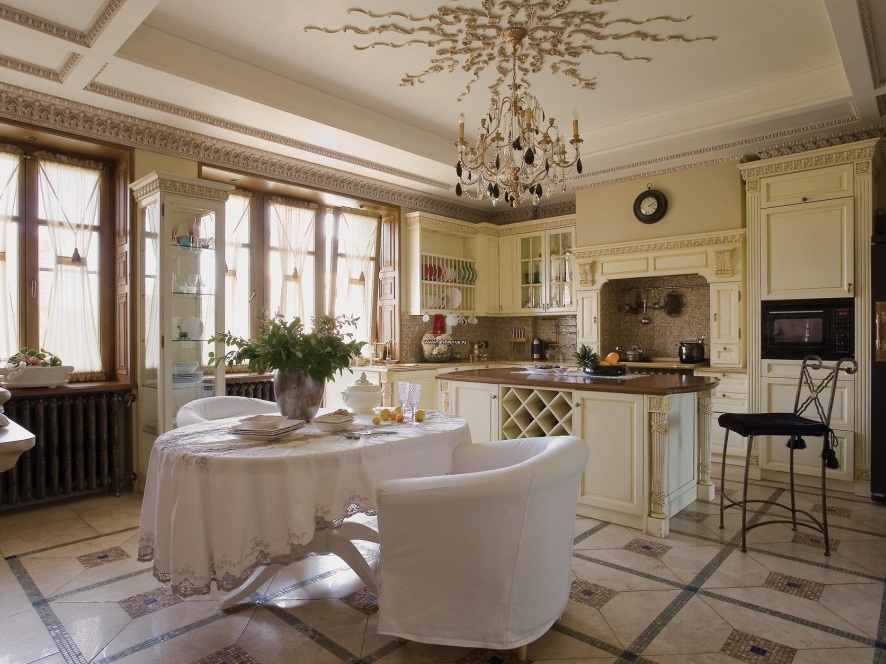 Um eine Küche in einem klassischen Stil zu schaffen, müssen Sie immer die aktuellen Farben verwenden: Weiß, Schwarz, Gold, Silberfarben - perfekt. Das Ornament auf der Fliese oder dem Laminat kann fehlen oder ruhig sein. Für den klassischen Stil sind geprägte Dekore akzeptabel.