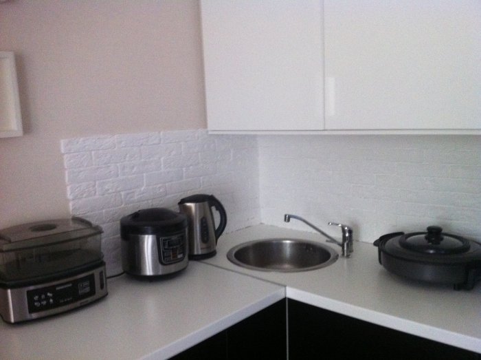- Gipsfliese - effektiv, aber nicht praktisch. In der Reliefoberfläche und den Nähten sammelt sich Schmutz an, der sehr schwer auszuwaschen ist. Fliese aus Gips ist geeignet für die Fertigstellung des Essbereiches. Sie können auch eine Schürze mit diesem Material anordnen, aber gleichzeitig ist es notwendig, die Fliesen mit Dekorlack zu bedecken.