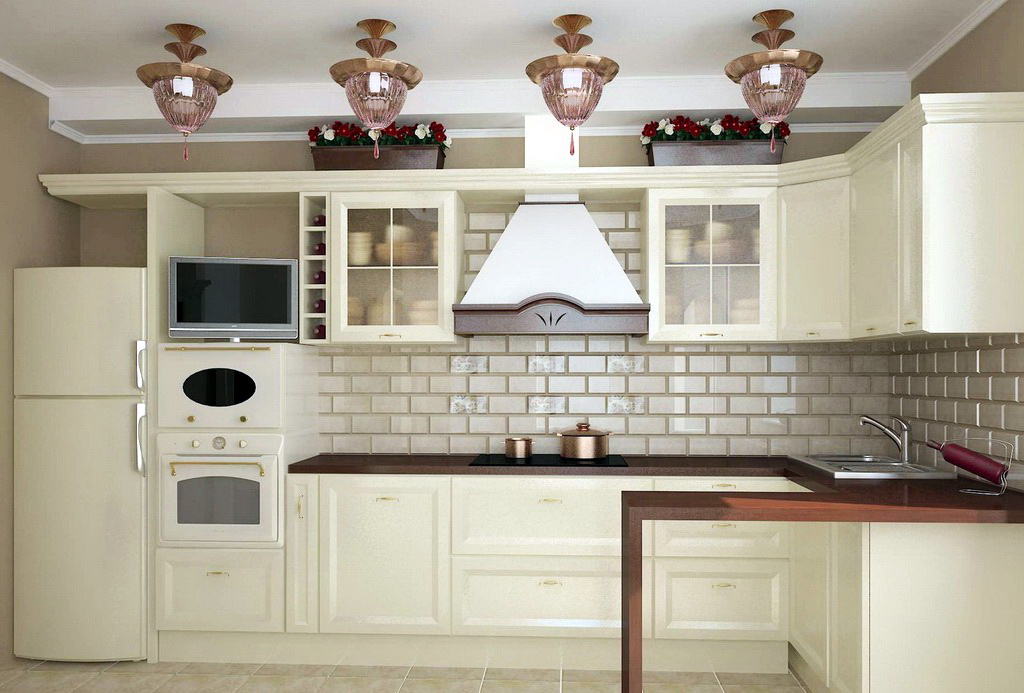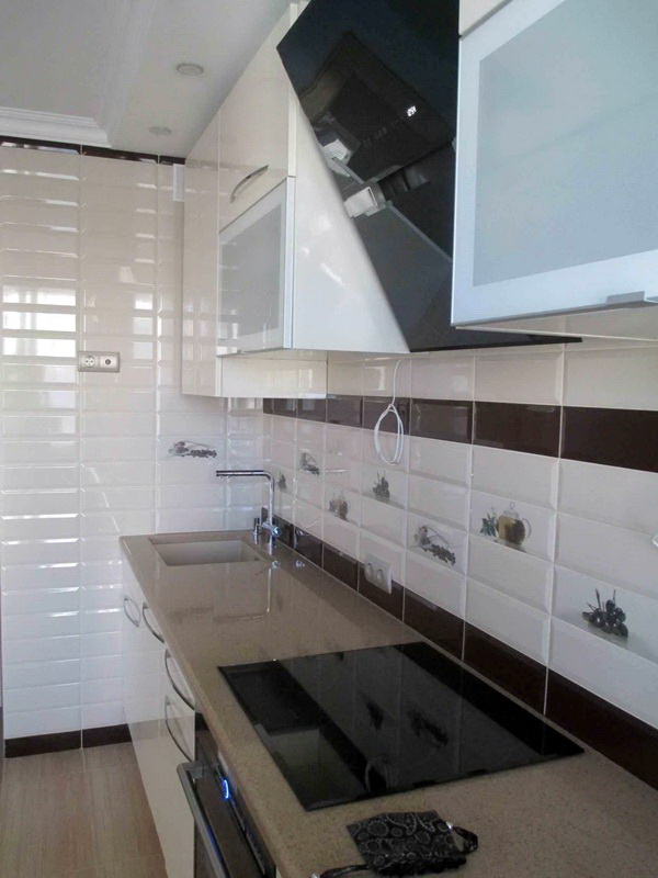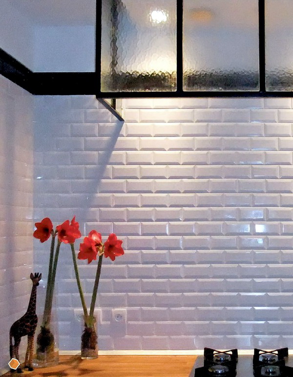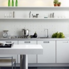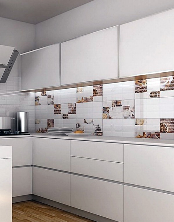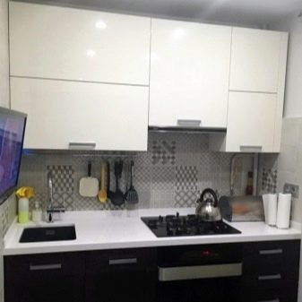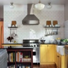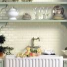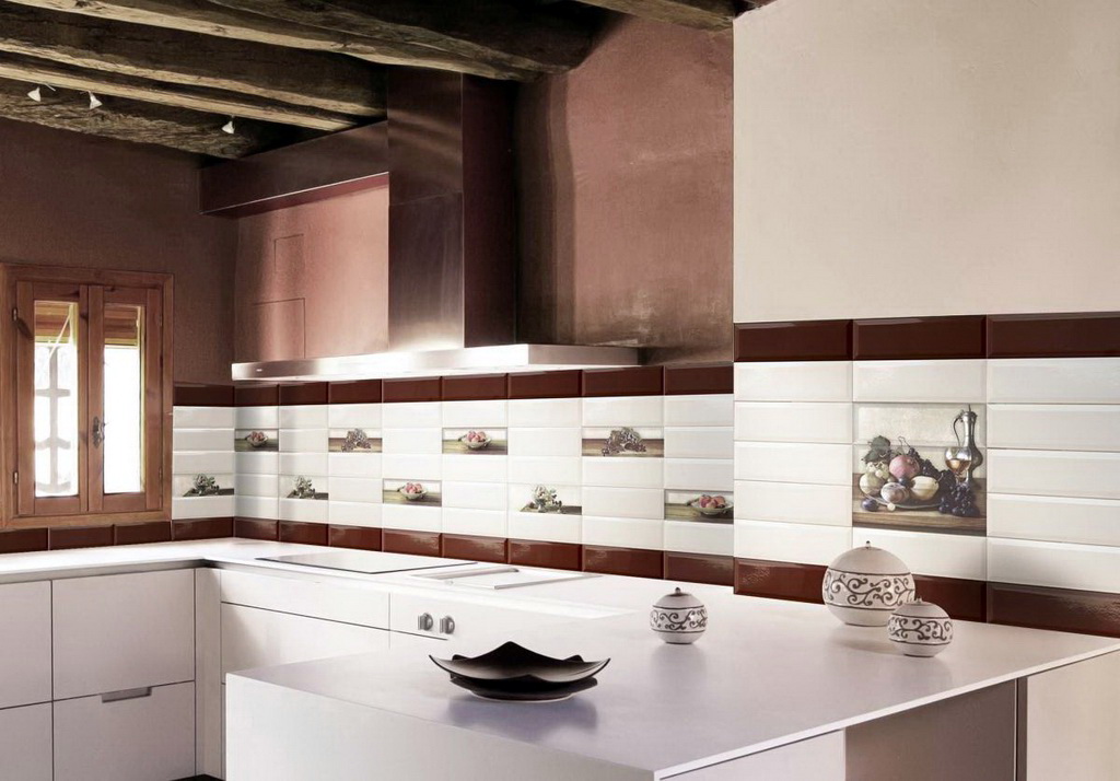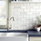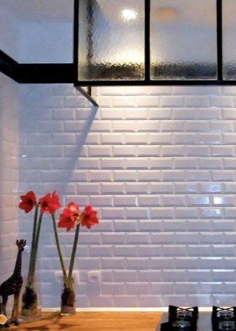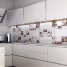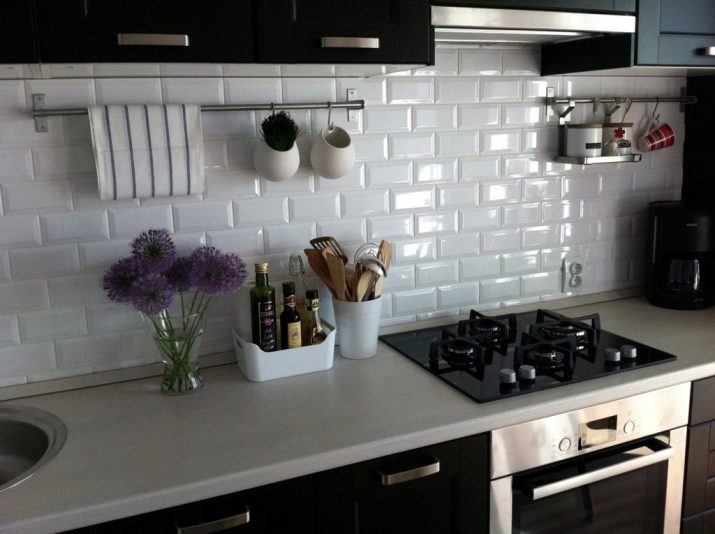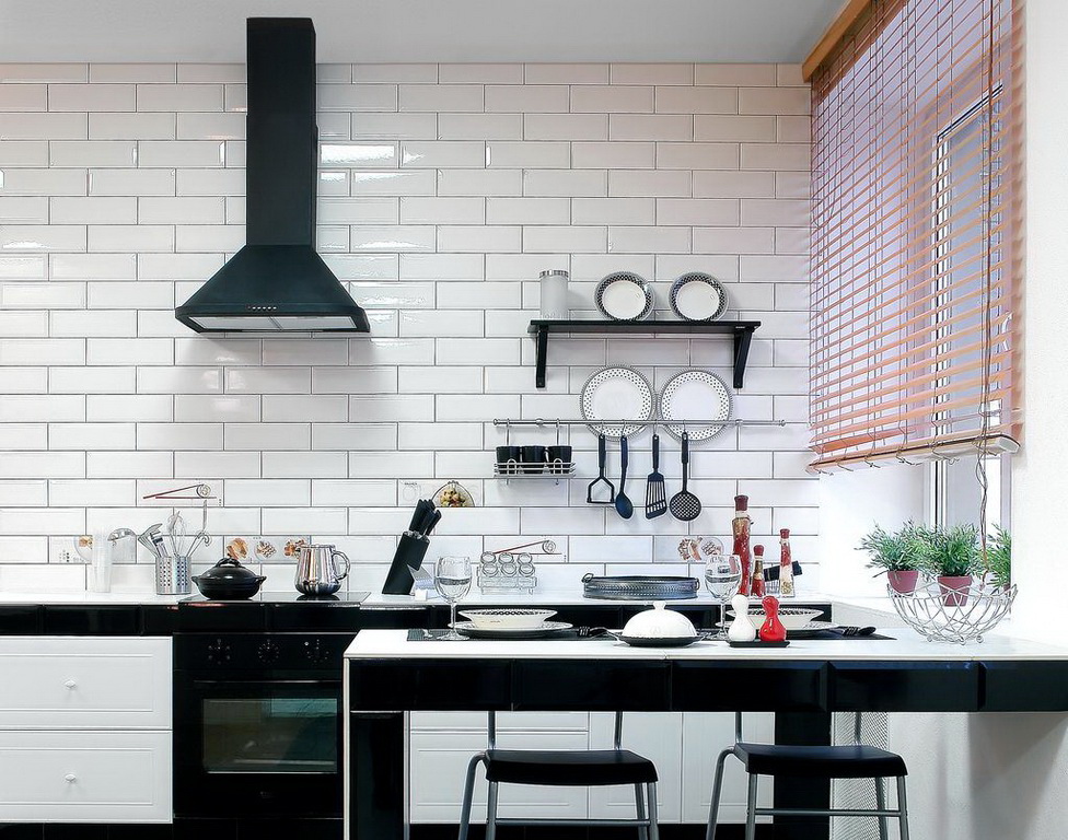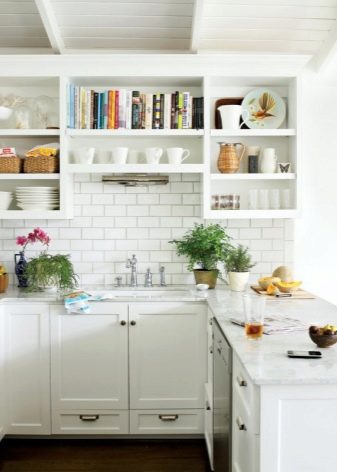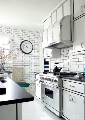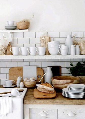 So mag eine weiße Küche mit einer Ziegelschürze die Aussicht mit ihrer schneeweißen Schönheit erfreuen, zudem ist auf weißem Hintergrund eine Verschmutzung in Form von Staub, Dreck, fettigen Spritzer und Flecken durch nasses Reiben nicht so deutlich zu sehen wie auf einer dunklen Fliese.Ein weiteres Plus der "Schweine" -Kacheln in weißer Farbe ist, dass sie der Küche Ästhetik und Genauigkeit verleihen. Wenn Sie eine weiße Kachel mit einer Schürze einer Miniküche machen, sieht ihr Platz optisch größer aus, als sie tatsächlich ist.