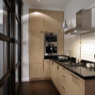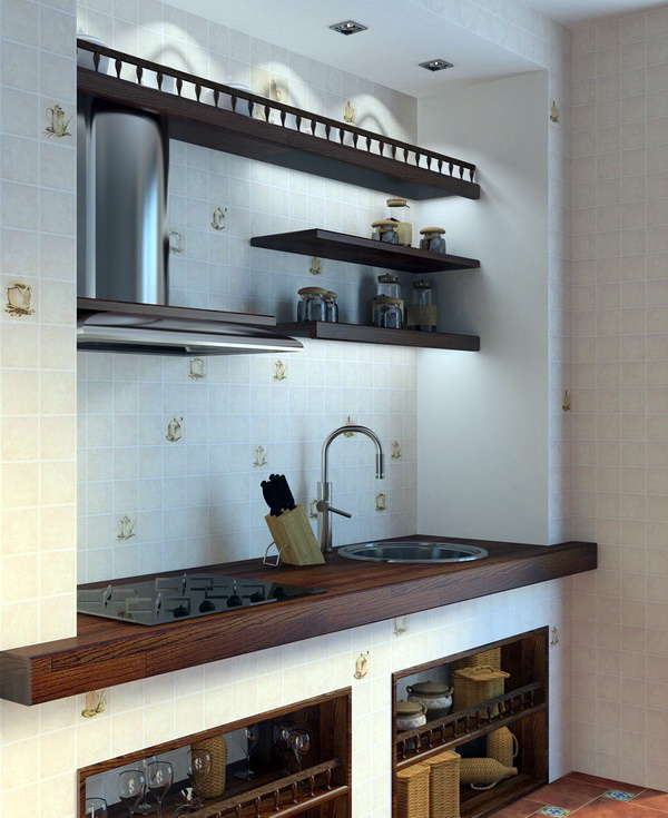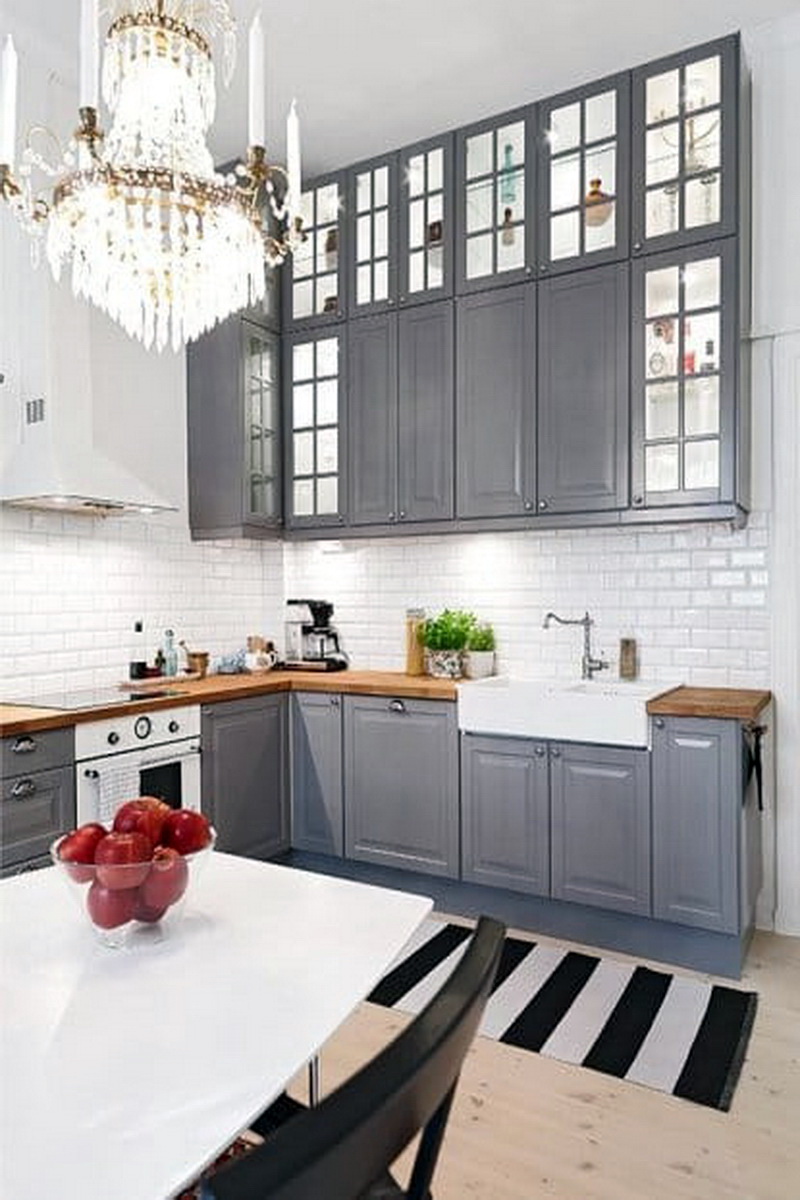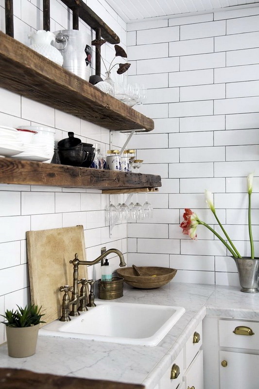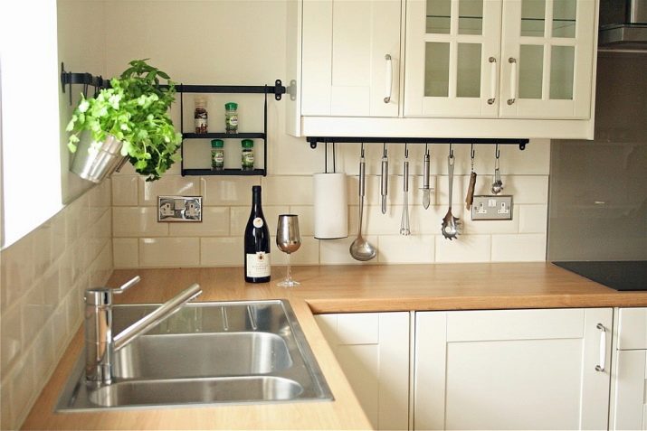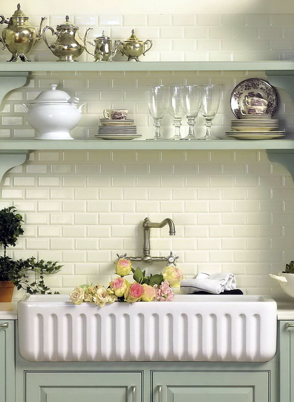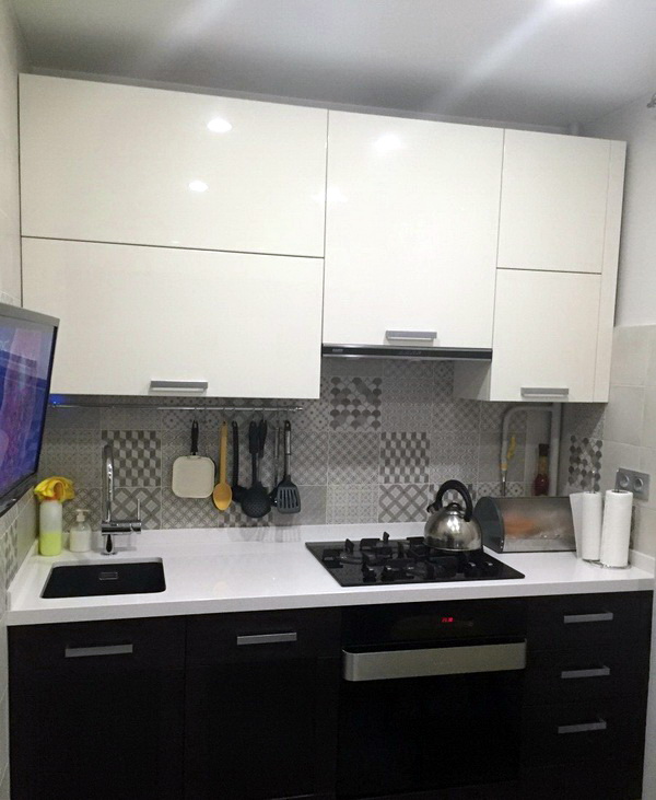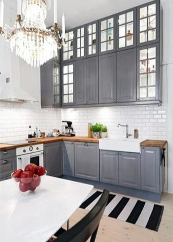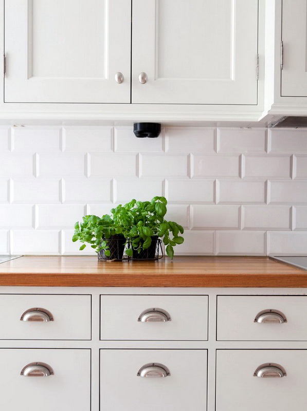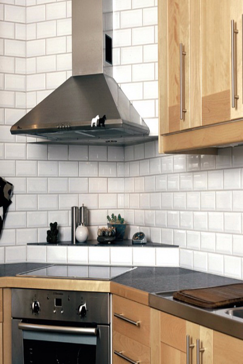 So mag eine weiße Küche mit einer Ziegelschürze die Aussicht mit ihrer schneeweißen Schönheit erfreuen, zudem ist auf weißem Hintergrund eine Verschmutzung in Form von Staub, Dreck, fettigen Spritzer und Flecken durch nasses Reiben nicht so deutlich zu sehen wie auf einer dunklen Fliese.Ein weiteres Plus der "Schweine" -Kacheln in weißer Farbe ist, dass sie der Küche Ästhetik und Genauigkeit verleihen. Wenn Sie eine weiße Kachel mit einer Schürze einer Miniküche machen, sieht ihr Platz optisch größer aus, als sie tatsächlich ist.