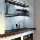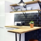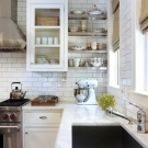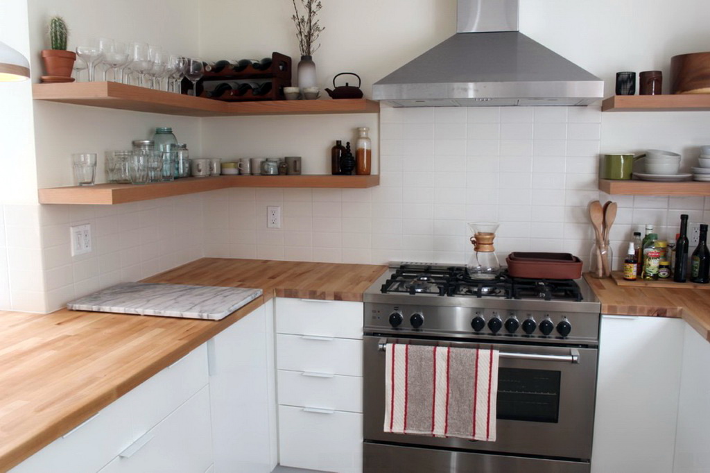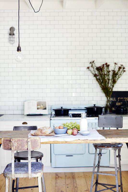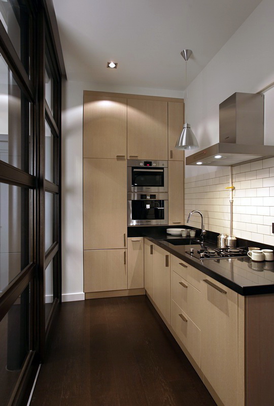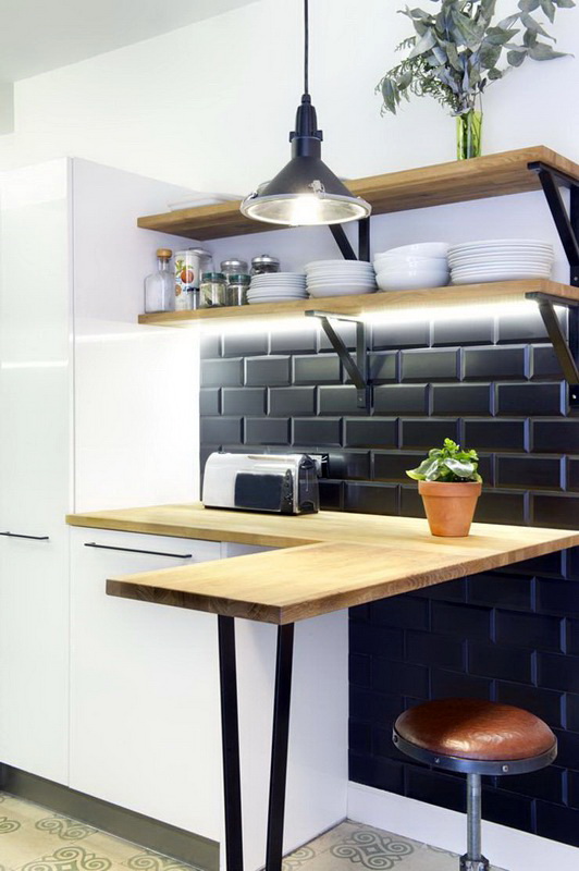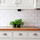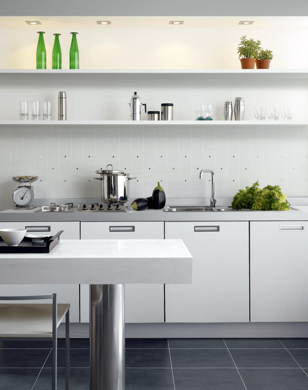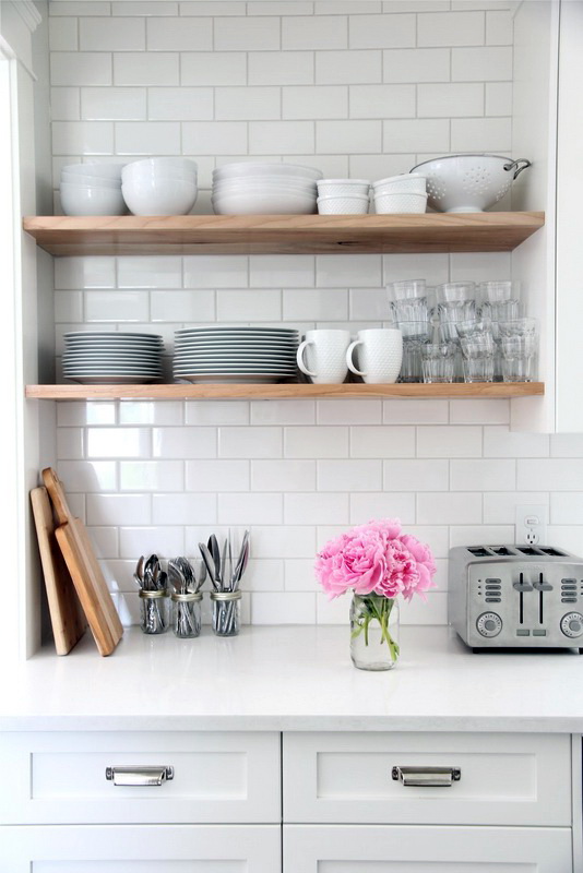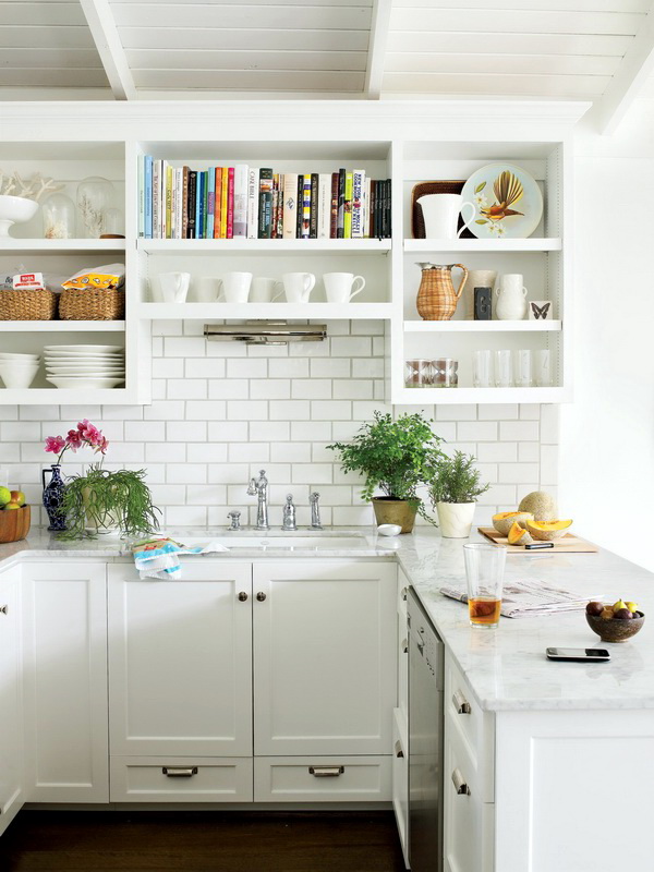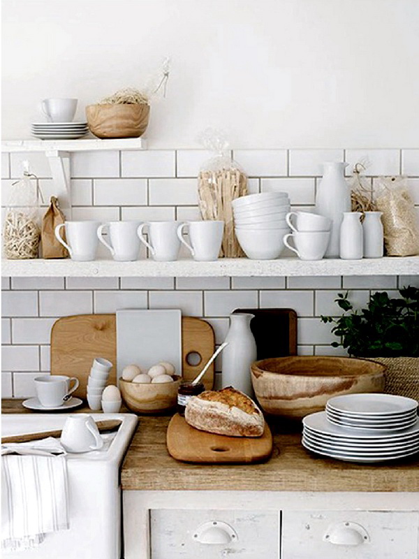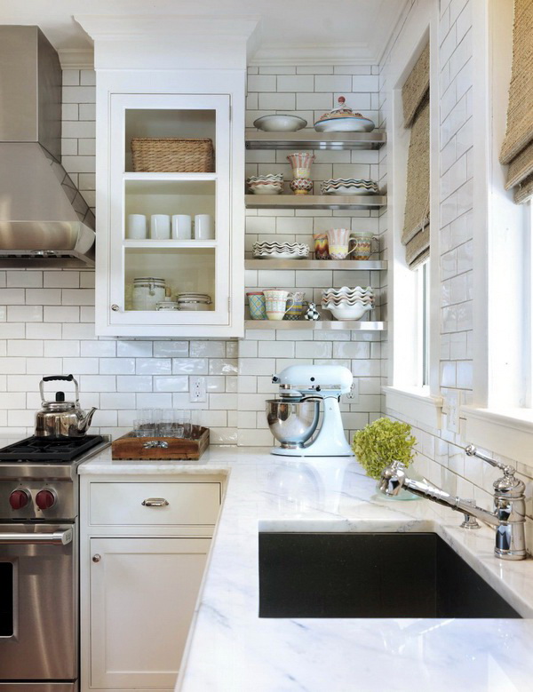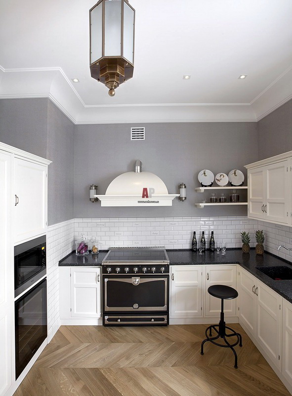 So mag eine weiße Küche mit einer Ziegelschürze die Aussicht mit ihrer schneeweißen Schönheit erfreuen, zudem ist auf weißem Hintergrund eine Verschmutzung in Form von Staub, Dreck, fettigen Spritzer und Flecken durch nasses Reiben nicht so deutlich zu sehen wie auf einer dunklen Fliese.Ein weiteres Plus der "Schweine" -Kacheln in weißer Farbe ist, dass sie der Küche Ästhetik und Genauigkeit verleihen. Wenn Sie eine weiße Kachel mit einer Schürze einer Miniküche machen, sieht ihr Platz optisch größer aus, als sie tatsächlich ist.