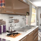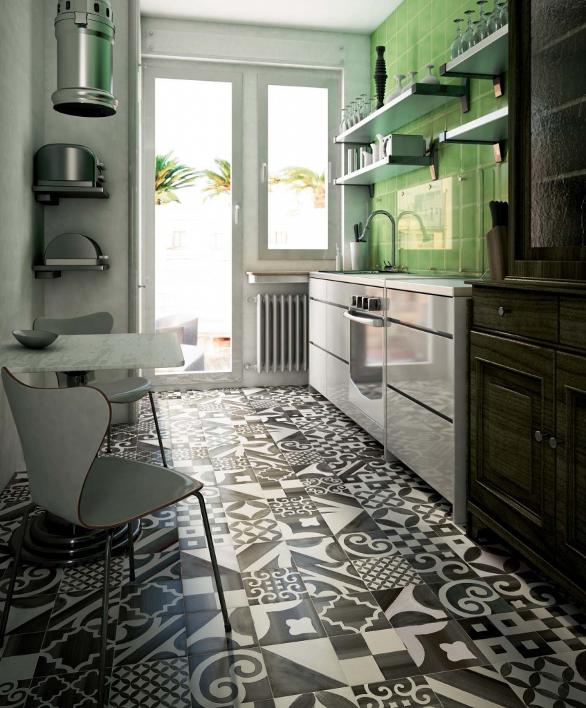 - Wenn Sie eine Fliese mit einem Muster wählen, denken Sie daran, dass in einer kleinen Küche ein schönes Muster gut aussieht,und im geräumigen - groß. Die Zeichnung sollte als Ergänzung zur Gestaltung der Küche dienen und nicht mit ihr in Konflikt geraten;