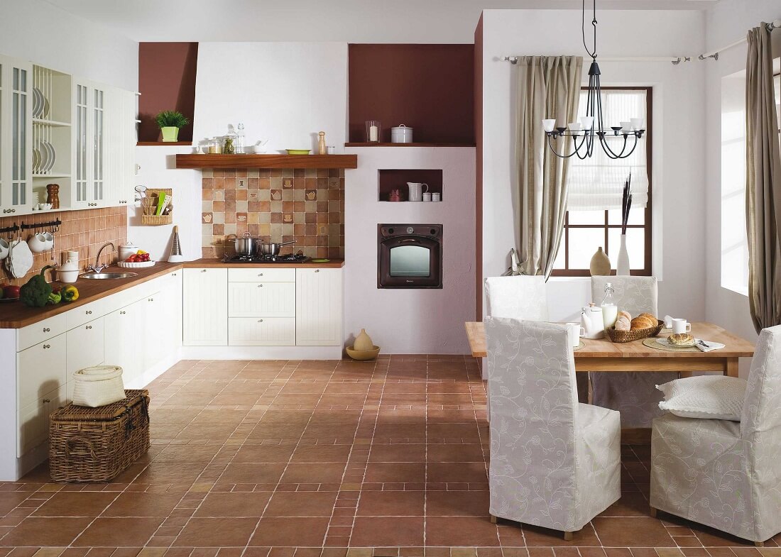 - Klinker Fliesen. Es sieht aus wie Feinsteinzeug, aber noch haltbarer. Ideal zum Auflegen auf den Küchenboden;