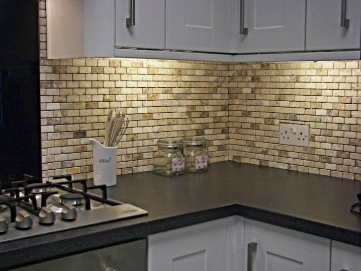 - Dekorative Fliesen aus Gips. Nicht die beste Wahl für die Küche, da diese Fliese eine erhöhte Oberfläche hat, die zusätzliche Schwierigkeiten bei der Pflege verursacht.Es kann nur in der Küche verwendet werden, wenn es sich nicht im Ofen befindet. Die Oberfläche solcher Fliesen muss lackiert sein;