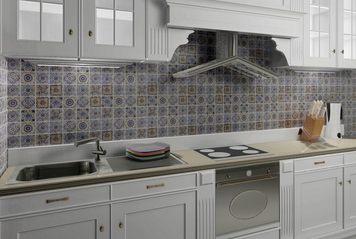 - Majolika-Fliese. Schöne, kleine Tonfliesen mit Bemalung. Am häufigsten verwendet, um die Küchenschürze zu dekorieren.