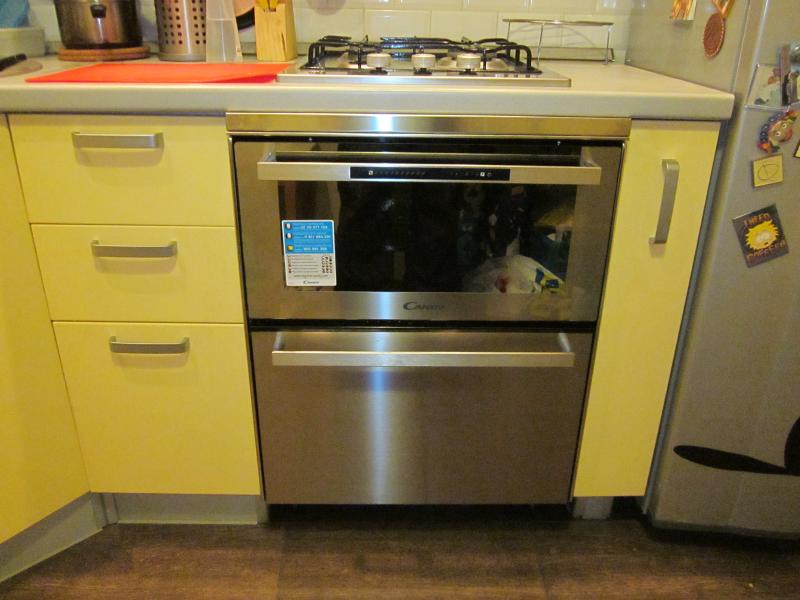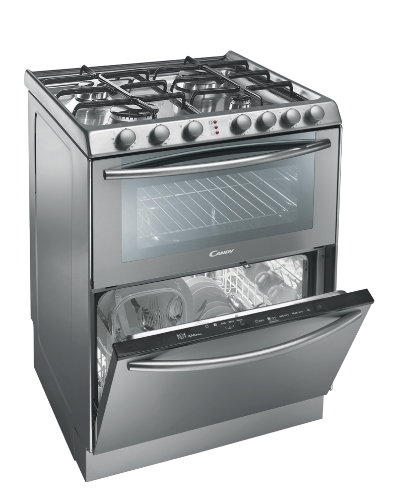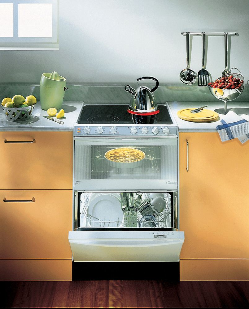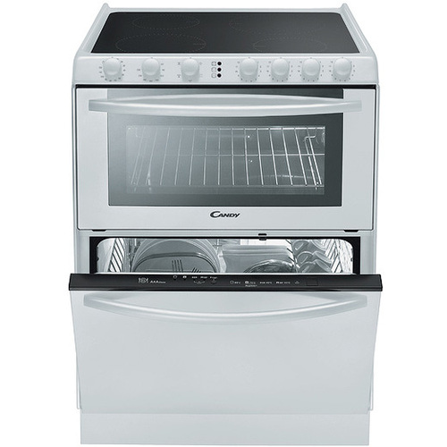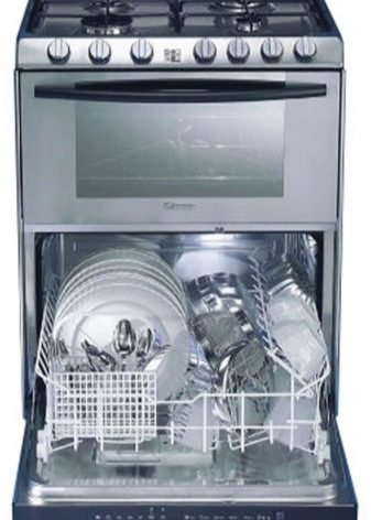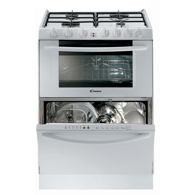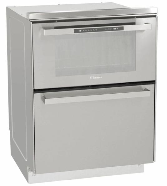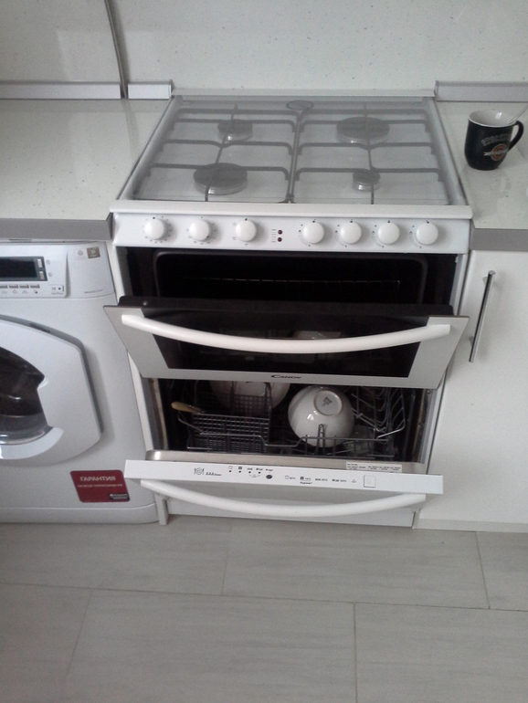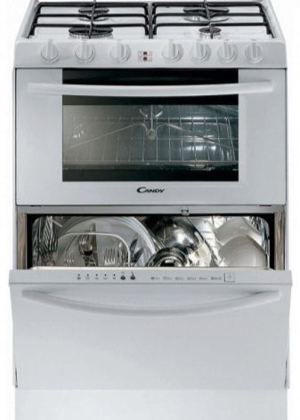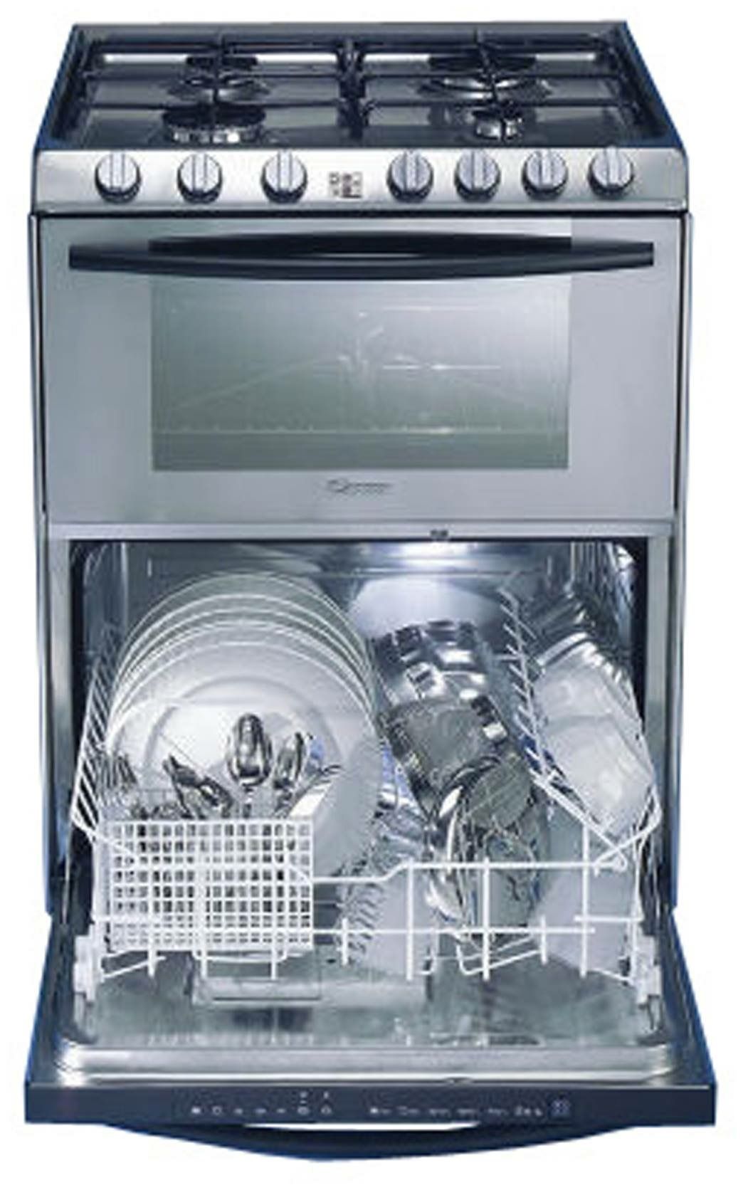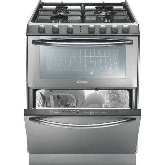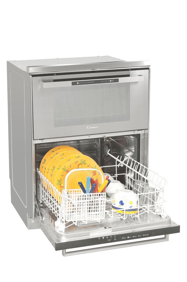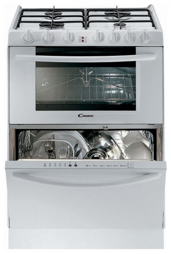 - Zwei-in-eins. Eine Spülmaschine und ein Ofen, dargestellt durch ein einzelnes Haushaltsgerät, ist die beliebteste Option. Meistens befindet sich der Geschirrspüler unter dem Ofen. Natürlich sind die Volumen der Gerichte, die gleichzeitig hineinpassen, viel geringer als in einem separaten Modell. Aber das Volumen im Gerät reicht aus, um das Geschirr nach einer einzelnen Mahlzeit einer Familie von 3-4 Personen zu waschen.