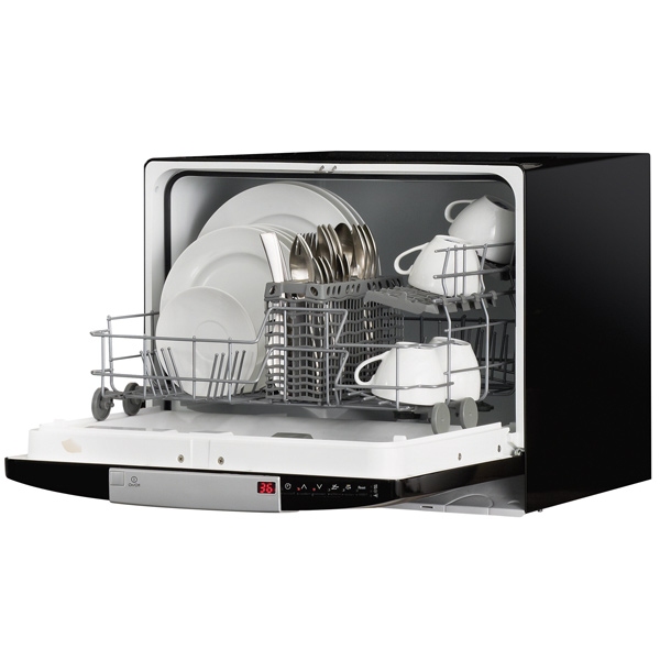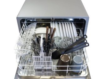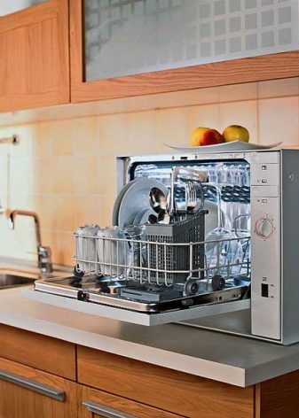 Kompakte Maschinen. Die Höhe solcher Maschinen beträgt durchschnittlich 450 mm, was vor allem die Platzersparnis und Modellmobilität bestimmt. Auch der Vorteil solcher Maschinen in der Preisklasse. Dieser Typ ist perfekt für Mietwohnungen, Villen und kleine Küchen. Sie sind nicht für die Installation auf dem Boden gedacht, solche Maschinen werden auf die Arbeitsplatten gestellt. Sparen mit solchen Maschinen zum Reinigen von Geschirr nicht nur im Raum, sondern auch in Preis, Wasserverbrauch und Strom.