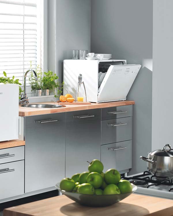 Meistens ist der Geschirrspüler verbunden: unter der Arbeitsplatte am Rand der Spüle, in der Nähe des Ofens, unter dem Herd, Gasplatte. Für das Desktop-Modell sind die Anschlussmöglichkeiten an jedem geeigneten Ort, aber so, dass die Länge des Abwasserschlauchs ausreicht und in der Nähe des Auslasses liegt. Solche Miniaturgeräte haben eine Größe mehr als eine Mikrowelle, sie können leicht an einen anderen Ort umgeordnet werden.