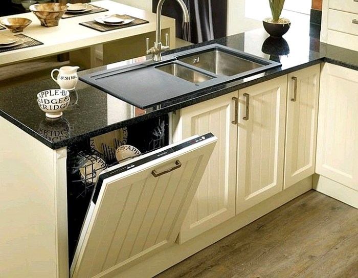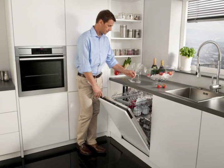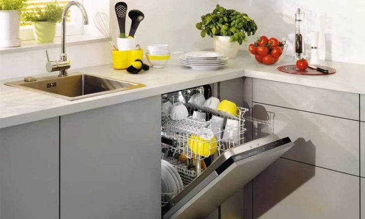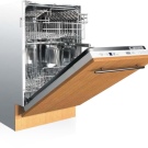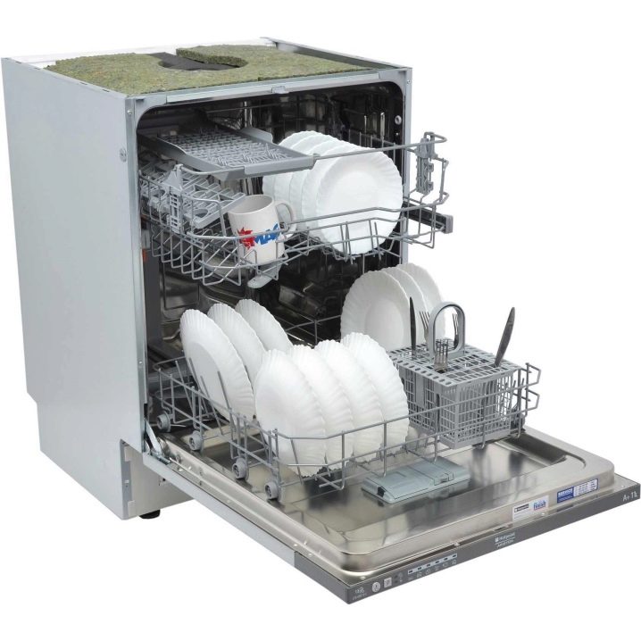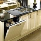 Das eingebaute Modell der Spülmaschine ist eine Technik, die in einem speziell vorbereiteten Schrank in der Küche installiert wird. Dieser Geschirrspüler passt perfekt in das Innere einer bestimmten Küche. In der Optik unterscheiden sich die Einbaugeräte nicht vom Stil des Küchensets, ein Unwissender wird wahrscheinlich nicht gleich feststellen können, in welchem Schrank der Geschirrspüler steckt.