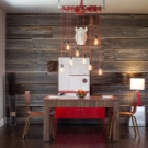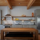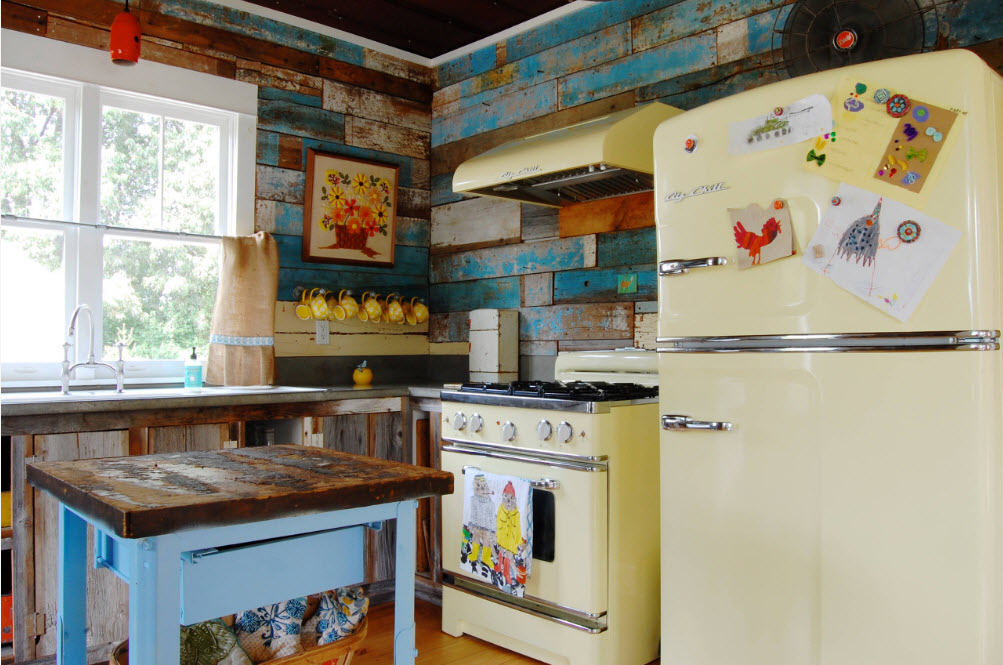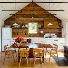Anstatt zu malen, können Küchenwände mit einem so spektakulären Material wie Schindeln verkleidet werden, die aus Plastik (Abstellgleis), Holz oder MDF bestehen können.