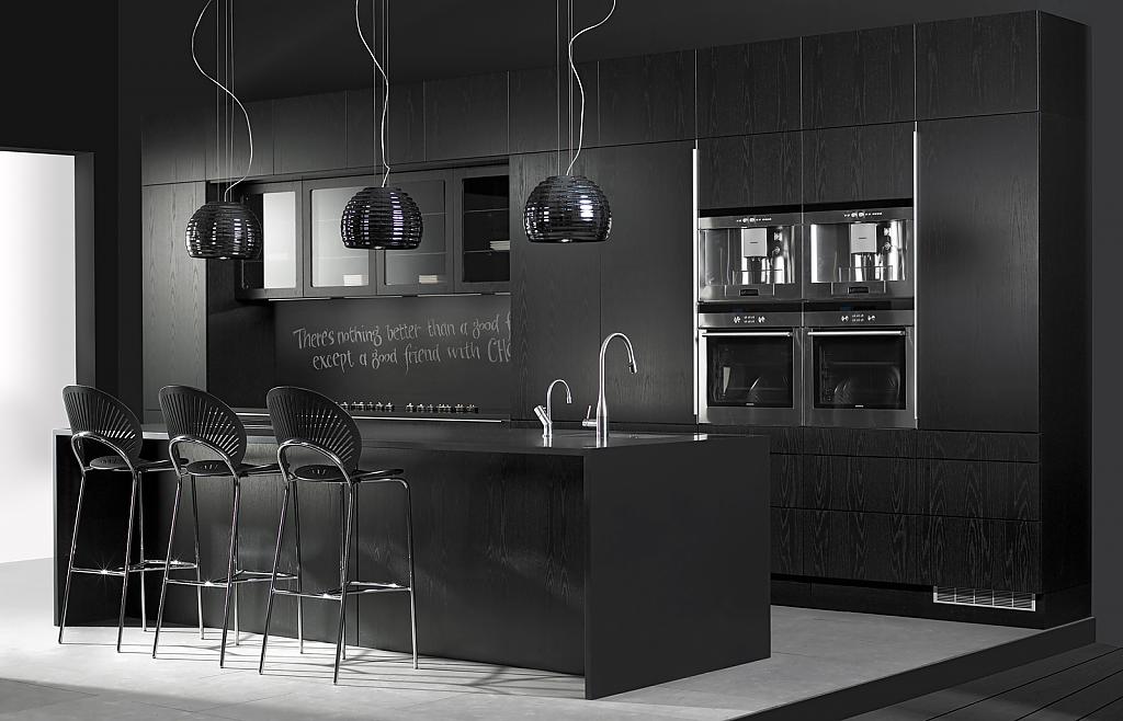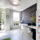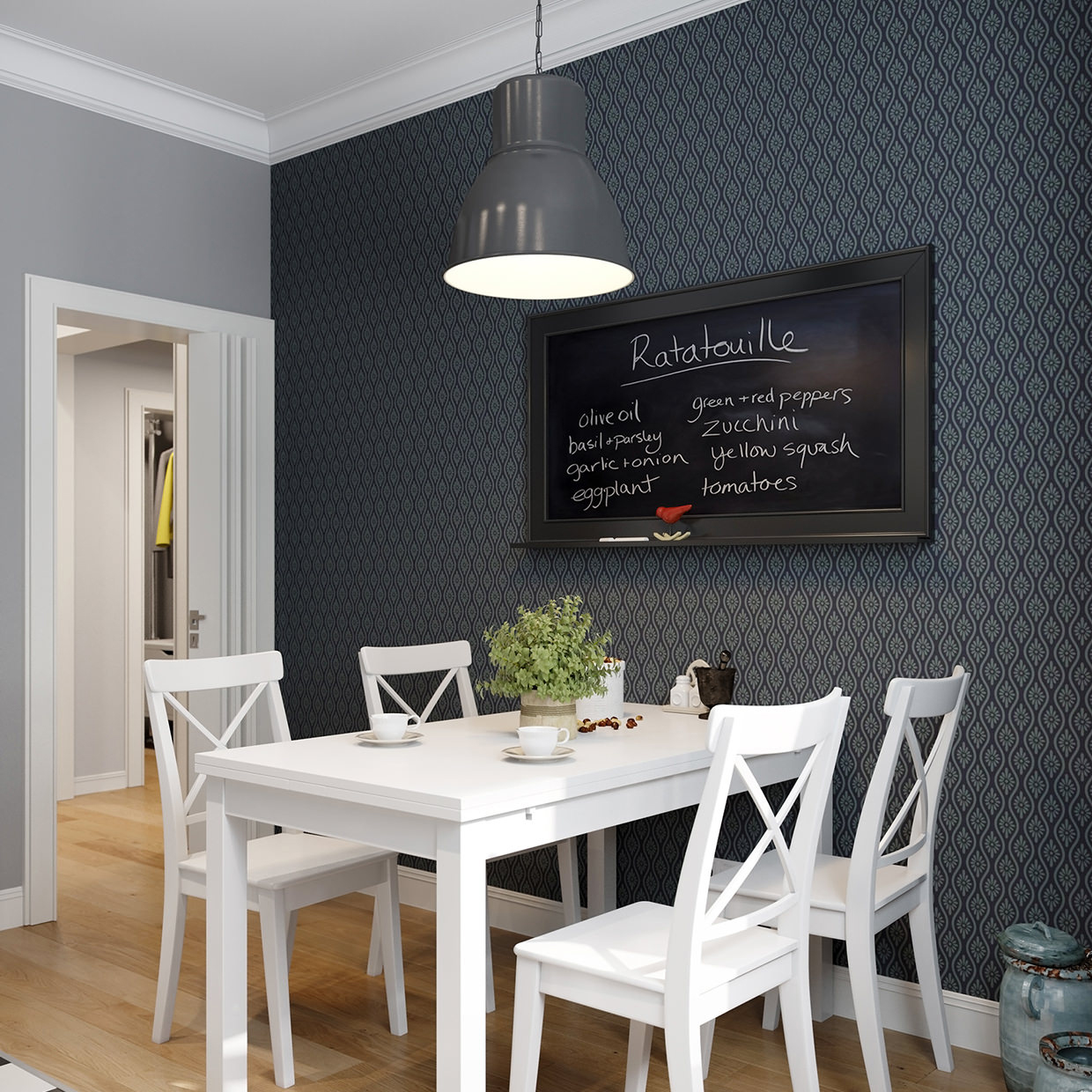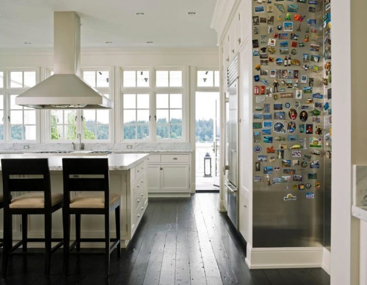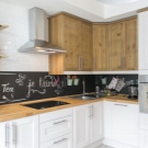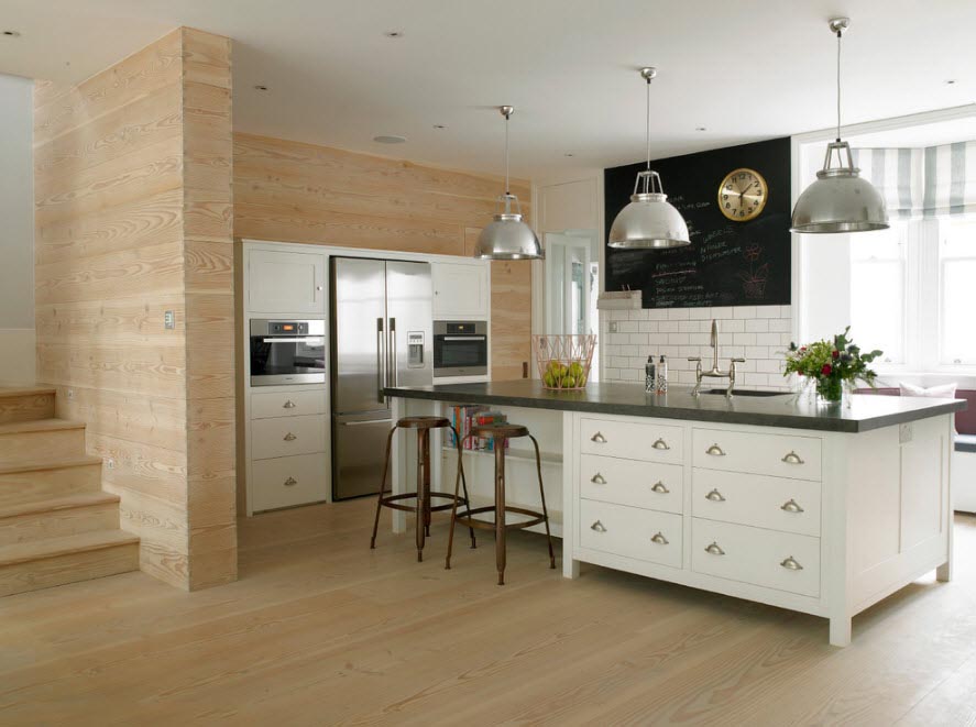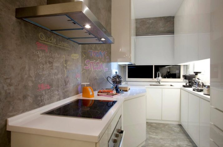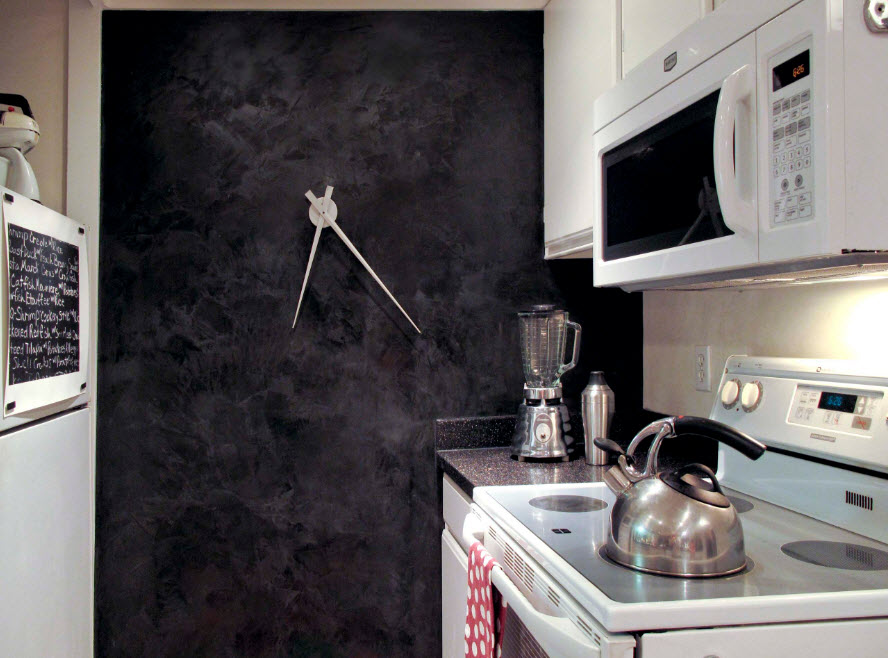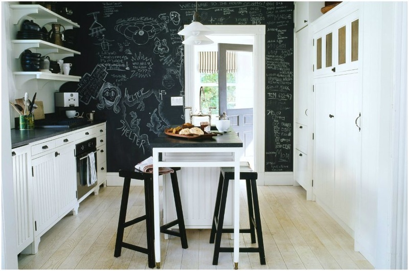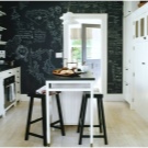 Kreativ in Bezug auf Design und bequem für den Einsatz wird die Wand in der Küche in Form eines Schiefers ausstatten.Es kann entweder klein sein, nicht mehr als einen Meter oder die Größe einer Küchentür. Eine solche Tafel bietet den perfekten Ort für kurze Rezepte, eine Liste von Lebensmitteln und Erinnerungen. Zweifellos sollte solch ein kontrastierendes Detail mit dem Rest des Designs kombiniert werden.