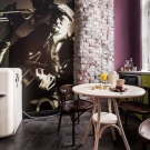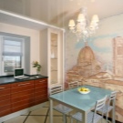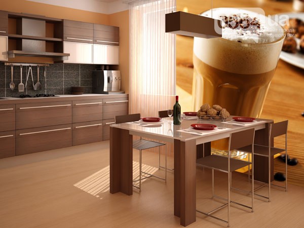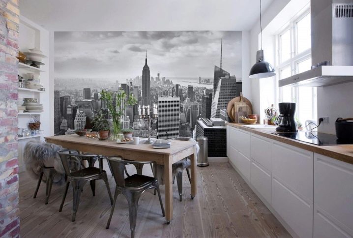 Fototapete kann auch verwendet werden, um die Küche zu dekorieren. Normalerweise wählen Sie eine freie Wand, nicht mit Möbeln vollgestopft, die mit einem Bild nach Ihrem Geschmack dekoriert ist. Es gibt verschiedene Arten von Fototapeten, in einigen Fällen können sie durch eine selbstklebende Folie ersetzt werden. Eine solche Wand mit Fototapeten kann zu einem Essbereich werden, wenn Sie einen Tisch oder eine Bar in der Nähe platzieren.