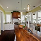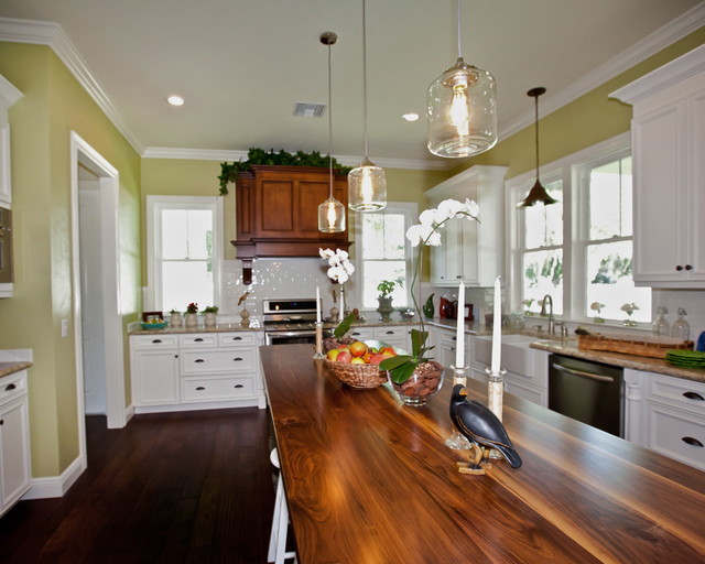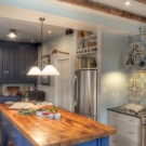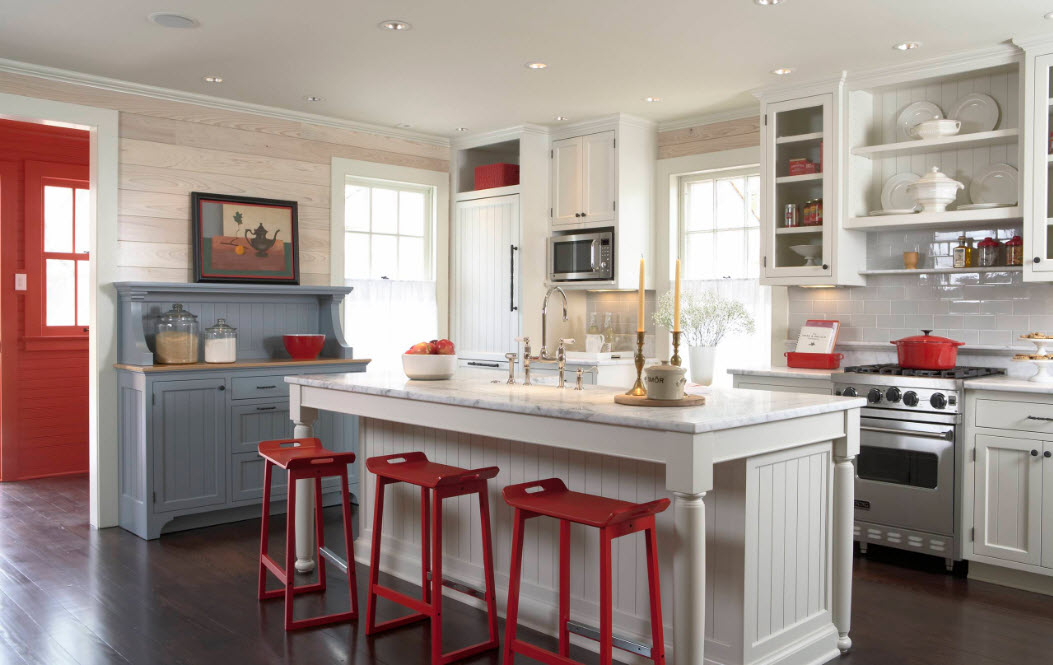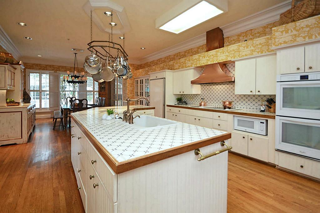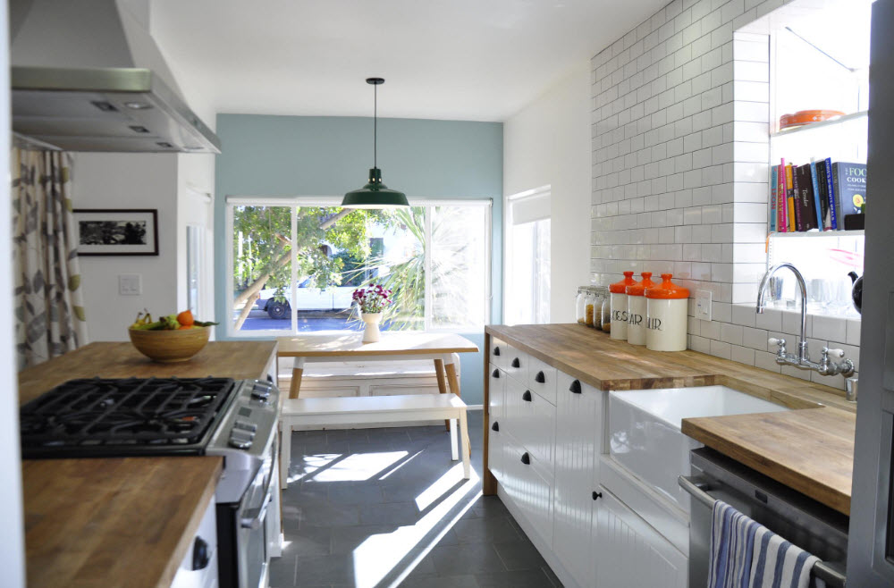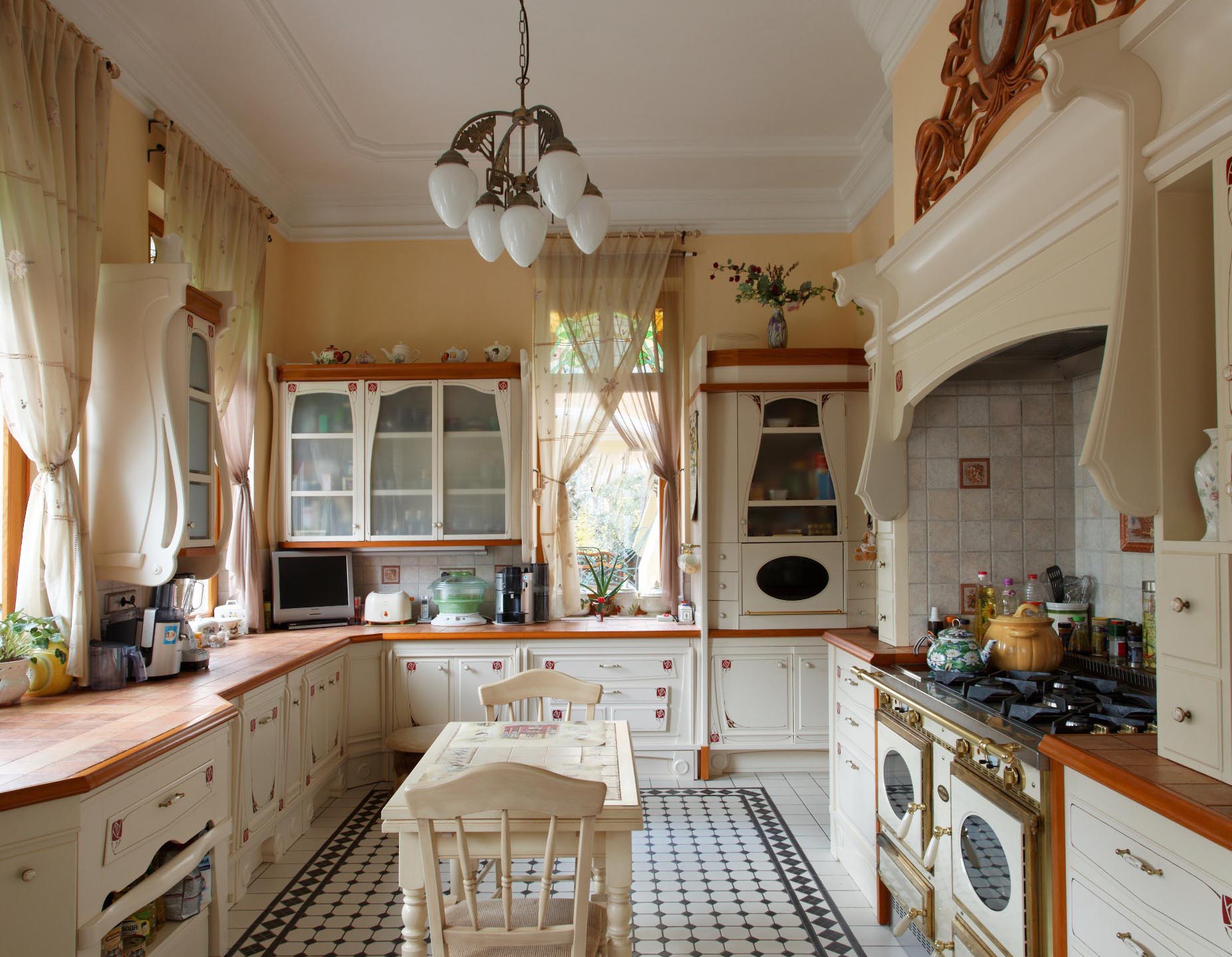 Auch in einer kleinen Küche ist Raum für Kreativität. Sie können an der Wand einen hellen Halter für Küchenmesser hängen. Auf der Kücheninsel wäre eine interessante Lösung, eine Halterung an der Decke zu befestigen und eine Reihe von Pfannen, antiken Kupfertöpfen und anderen Küchenutensilien aufzuhängen.