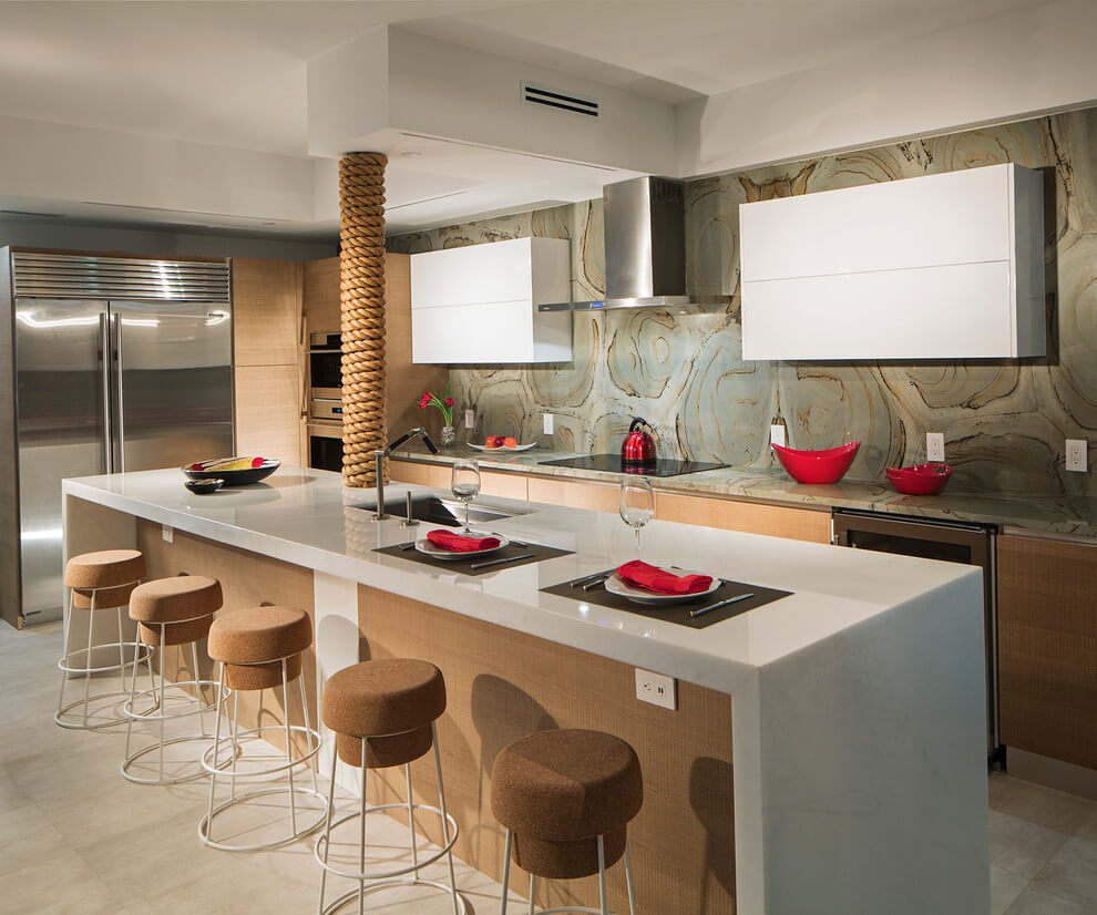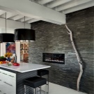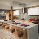 Eine solche Blende erscheint besonders interessant, wenn sie mit einem Barcounter kombiniert wird. Darüber hinaus kann der Bartresen von der Seite der Küche aus als Schrank dienen, und von der Seite des Wohnzimmers wird er wie eine mit einer Tischplatte abgedeckte Wanderhebung aussehen.