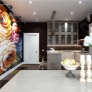 Glasplatten oder 3D-Bildschirme können nicht nur auf der Oberfläche einer Küchenschürze angebracht werden. Eine helle Glaswand in einem einzigen Farbschema macht auf den Essbereich in der Küche aufmerksam. Fotodruck auf Glas ist viel haltbarer als Tapete.