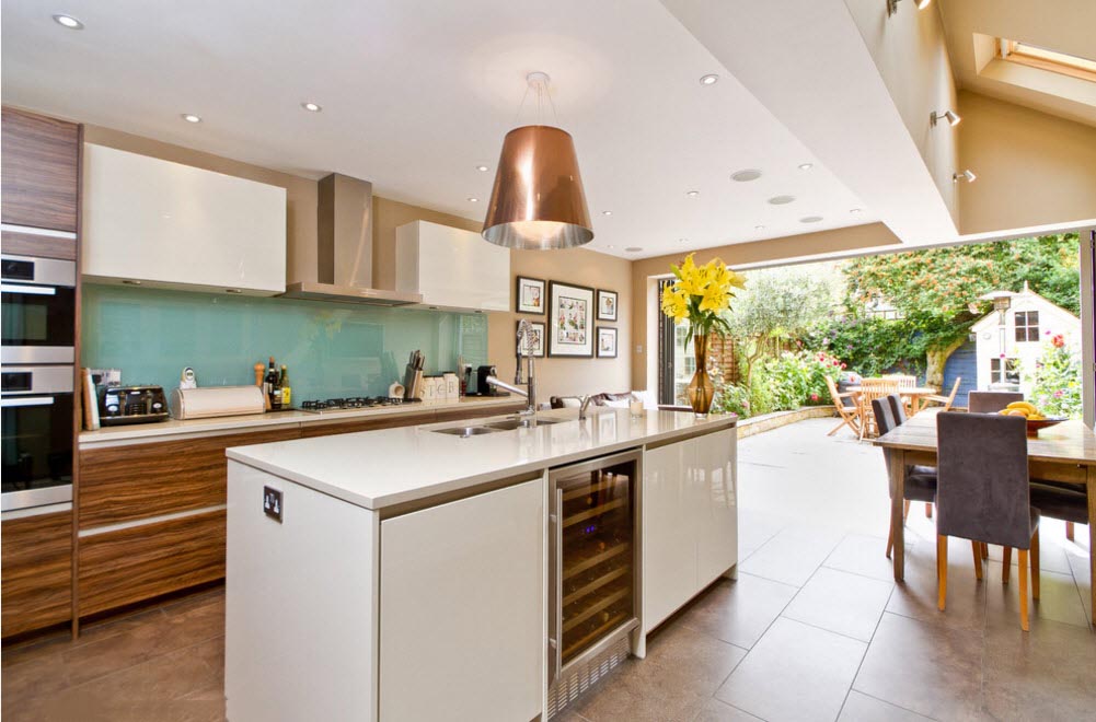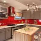 Füllen Sie den Raum zwischen den Küchenschränken helfen dekorative Platten. In den meisten unerwarteten Fällen können sie sogar Lichter sein, es hängt nur von der Vorstellungskraft des Besitzers ab.