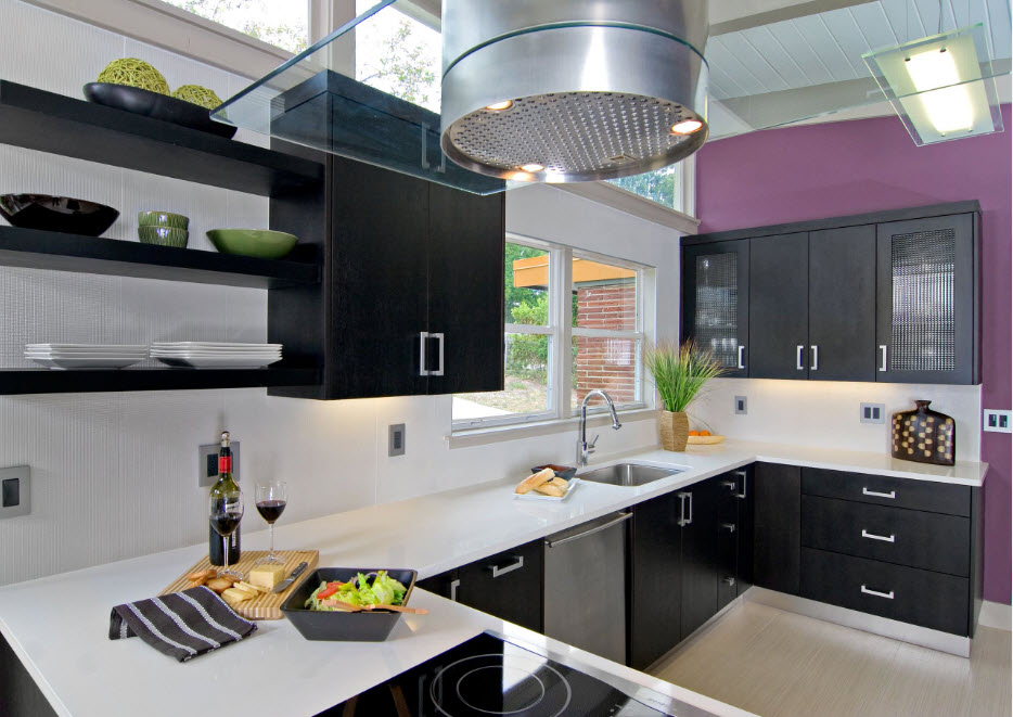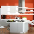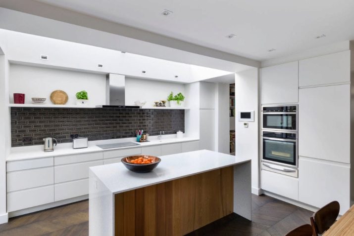 Für den Fall, dass zusätzliche Kommunikation in der Küche stattfindet, wird zum Beispiel eine Leiste mit einer eingebauten Lüftungsbox in der inneren Ecke montiert, wobei die Verwendung von Standardmöbeln unpraktisch sein kann. Dieser Moment wird helfen, die maßgeschneiderte Küche aufzuhellen. Als Ergebnis eines sorgfältig ausgewählten Möbeldesigns wird eine Küche mit Vorsprüngen in der Wand schließlich viel interessanter aussehen als eine typische Küche.