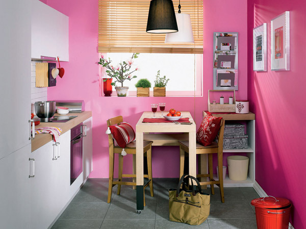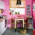 Die Verwendung von Farbe hilft bei der Raumzonierung. Helle Akzent-Rosa-Malerei der Wand wird im Gastbereich angemessen sein, und dunklere Burgunder- oder Brauntöne heben die Kochzone selbst hervor.