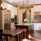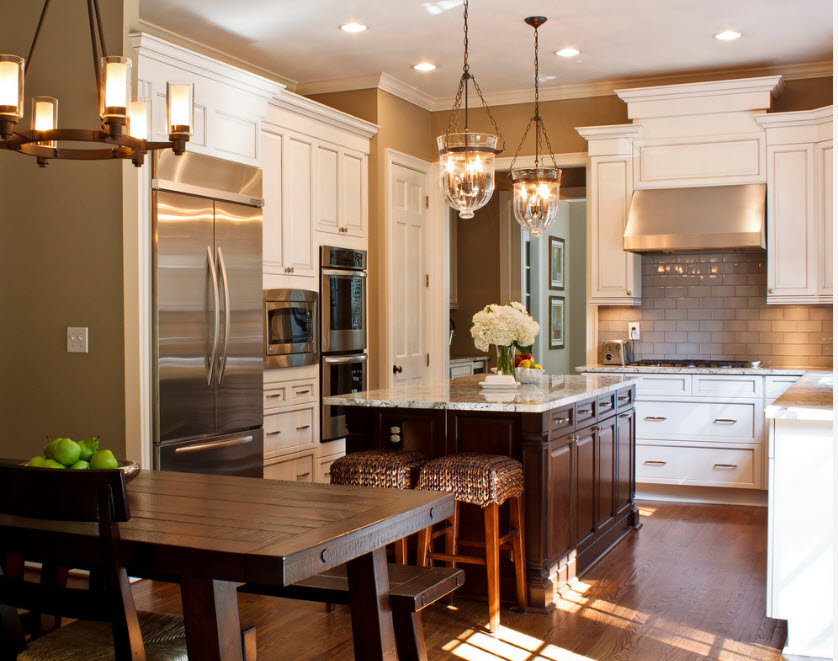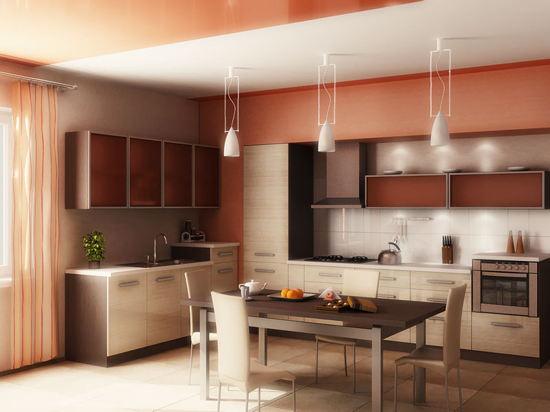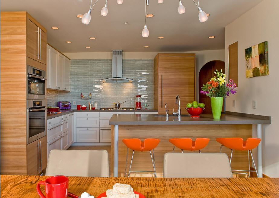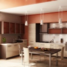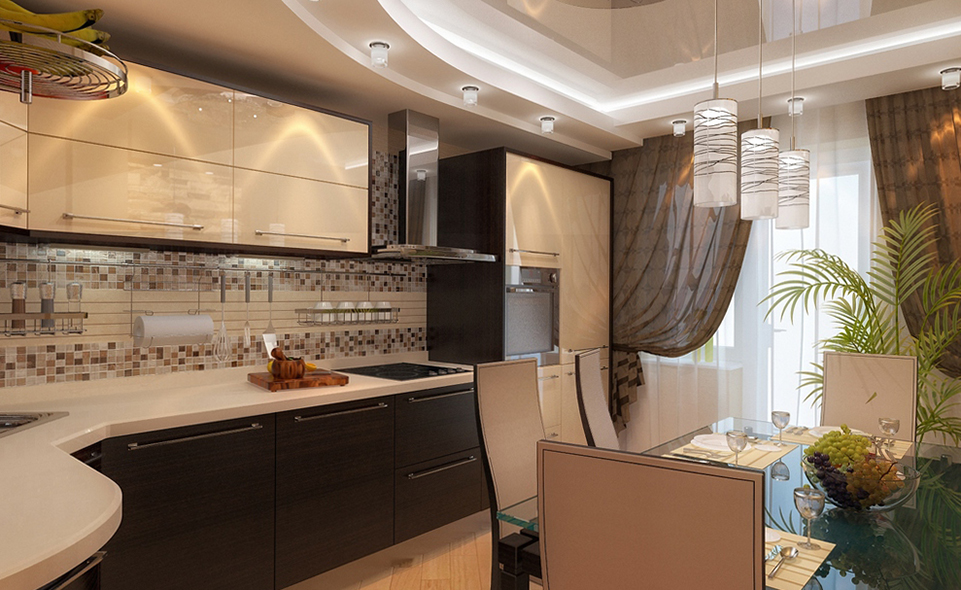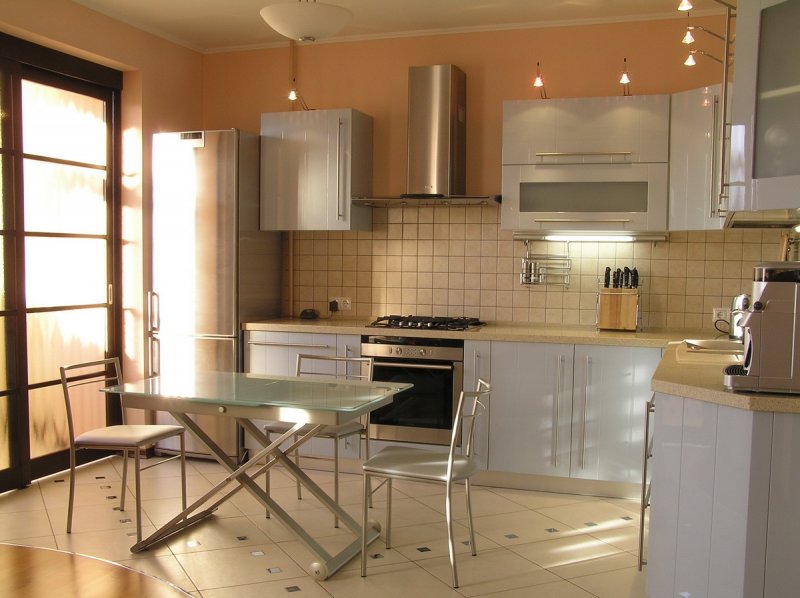 Für den Komfort und die Schaffung von Lichteffekten verwenden Sie Wandlampen und Lampen. Sie schaffen einen zusätzlichen Komfort bei der Zubereitung von Produkten und ermöglichen mit Hilfe des Lichtspiels eine unsichtbare Grenze von Küchenbereichen. Dabei werden zwei Ziele erreicht: Wir dekorieren den Raum und machen ihn warm, gemütlich und attraktiv für die Augen.