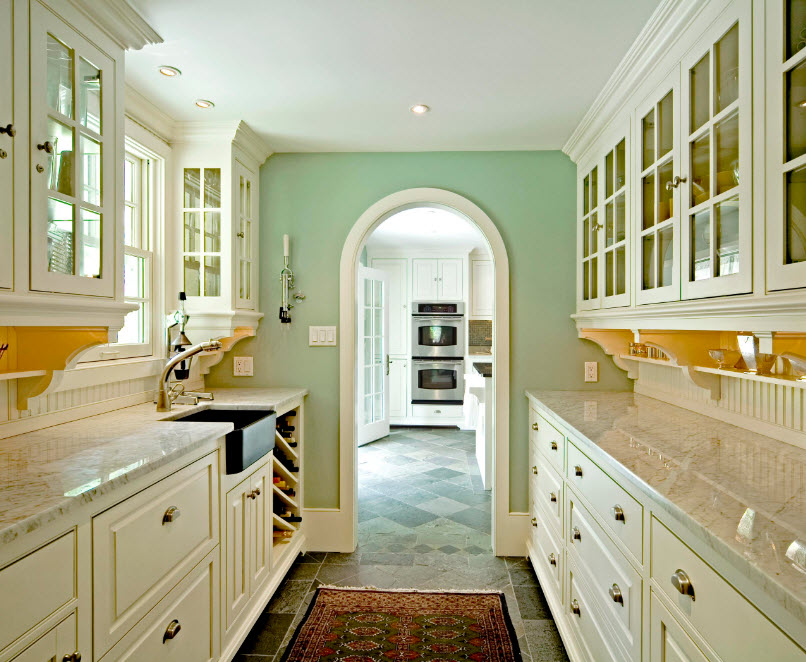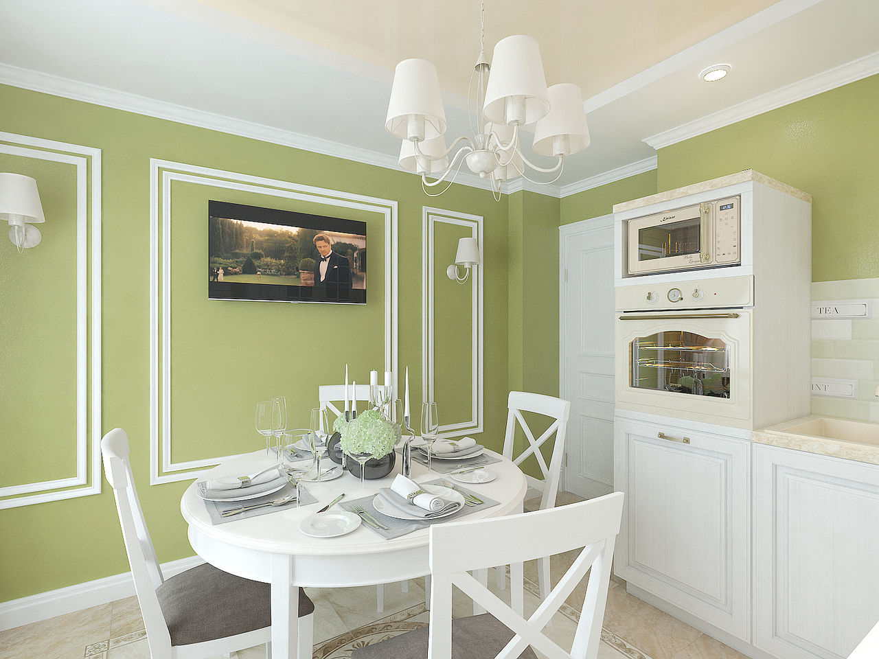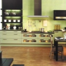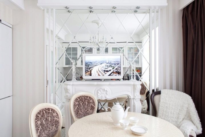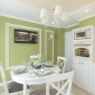 Eine visuelle Erweiterung des Raums in einer kleinen Küche wird helfen Glas- oder Spiegelwand und in hellen Pastellfarben dekoriert.