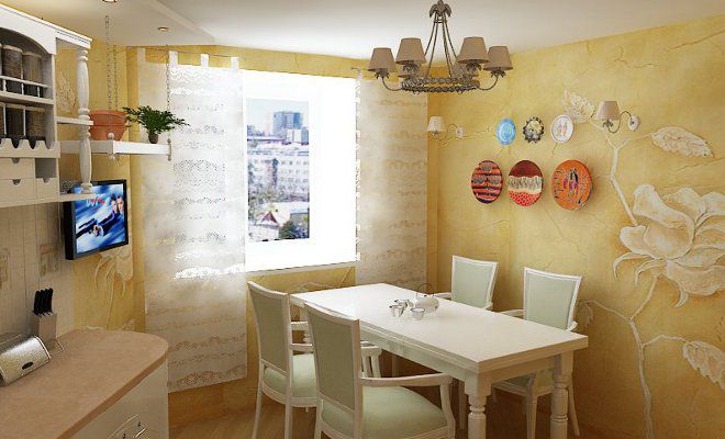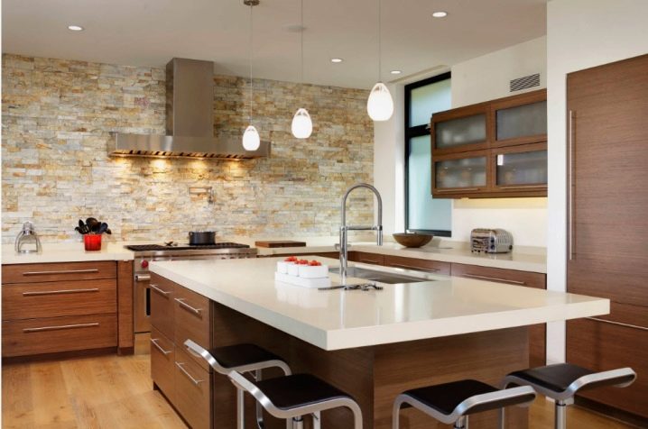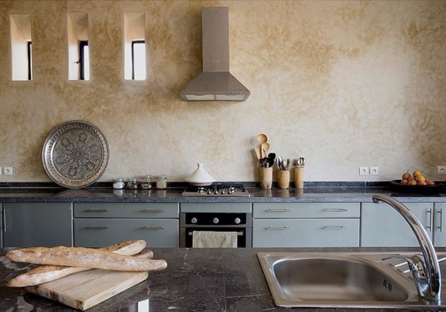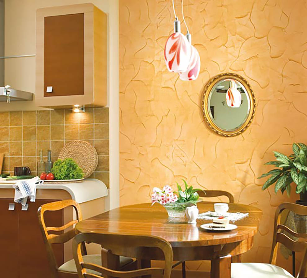 Eine gute Option für die Dekoration von Küchenwänden kann Dekorputz sein.Bis heute gibt es viele Arten von Gips-Mischungen, einschließlich Venetian, Silikon-, Struktur-und Marmor-Chips. Die Einbeziehung von organischen Aggregaten und Mineralfasern in Strukturputz ermöglicht es, die Wirkung von Holzrinde, Textur von Leinengewebe, Haut von Wildtieren oder Naturstein zu erhalten.