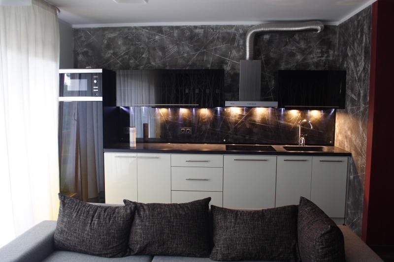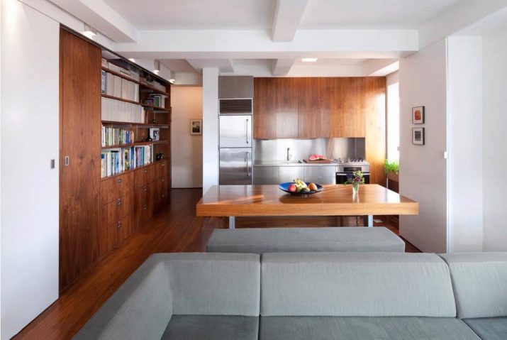In letzter Zeit ist eine Schiebewand zwischen der Küche und dem Wohnbereich populär geworden. Dies ist auch eine Trennwand, aber in einer ganz anderen Form, luftig und leicht. Es kann Glas oder aus Leichtbauplatten wie Gipskarton oder MDF sein. Eine Tür - ein Coupé oder eine Möbelteilwand - kann darin eingebaut werden, häufiger wird aber eine geräumige Originalöffnung in einer solchen Wand geschaffen.