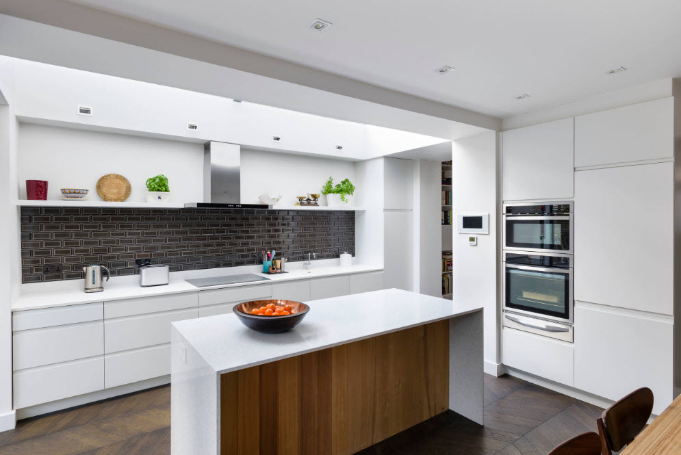 Wenn Sie Wandfliesen mit Naturholzfurnier verwenden, erhalten Sie eine Küche mit Holzwänden. Eine andere Option wäre die Verwendung von Futter aus Naturholz, mit Acryllack beschichtet. Ein Weißeiche Wandpaneel kann auch installiert werden, um die Exklusivität des Interieurs zu betonen.
