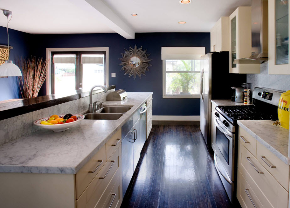 Die Verwendung von Farben in der kleinen Küche hat auch ihre Geheimnisse. Natürlich ist das dunkle Design in diesem Fall unangebracht. Es ist nicht wünschenswert, eine Küche von hellen und gesättigten Farben zu hängen, weil sie den Raum "essen". Optimal wählen Sie zwei Pastelltöne und kombinieren Sie sie in allen möglichen Variationen.