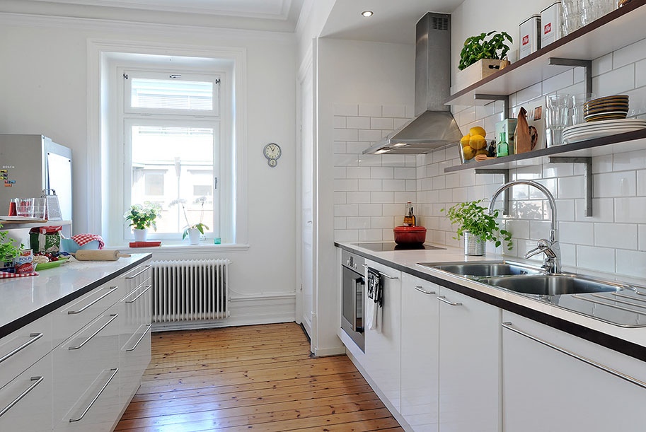 Die Arbeit an der Gestaltung des Küchenraums selbst umfasst zunächst die Verlegung von Abwasser- und Wasserleitungen und deren Verdeckung in den Wänden.Wenn die Rohre nicht verborgen werden können, sollten sie entlang des Bodens verlegt und mit Platten abgedeckt werden. Vorinstallationsrohre und Heizung müssen durch Metall- oder PVC-Rohre ersetzt werden.