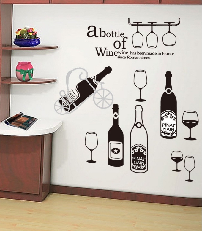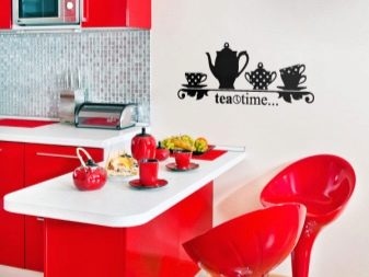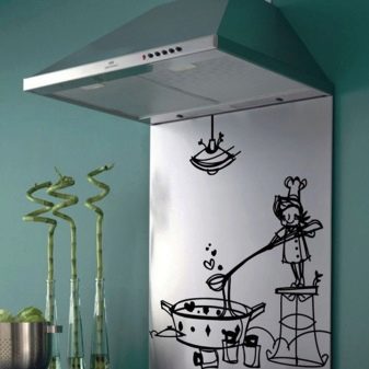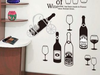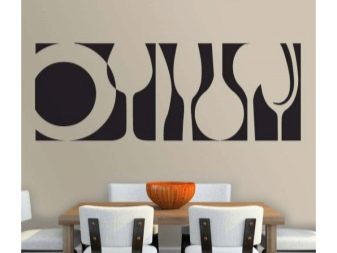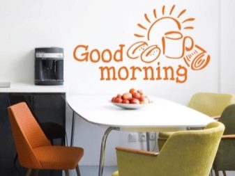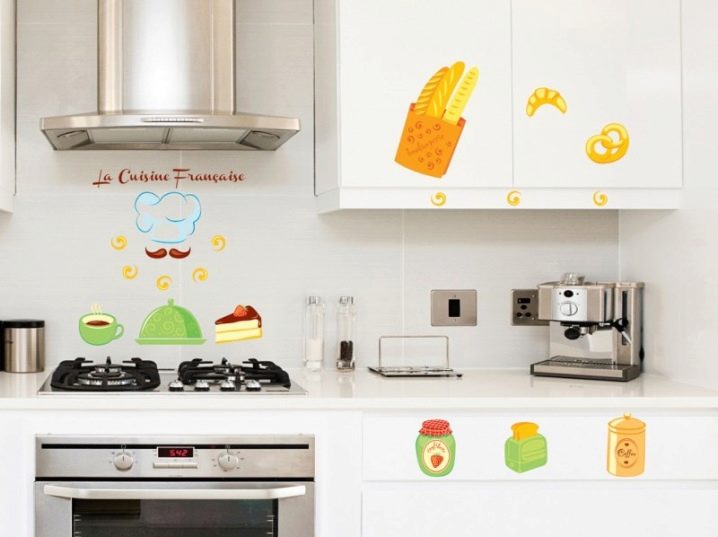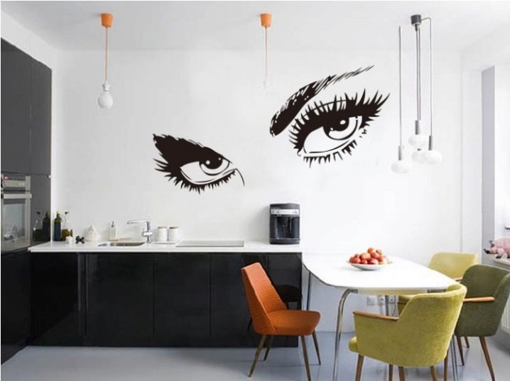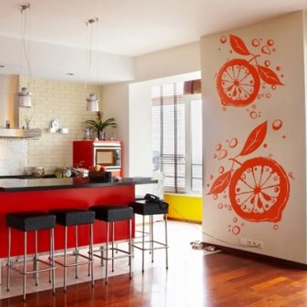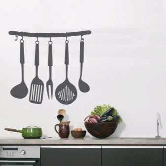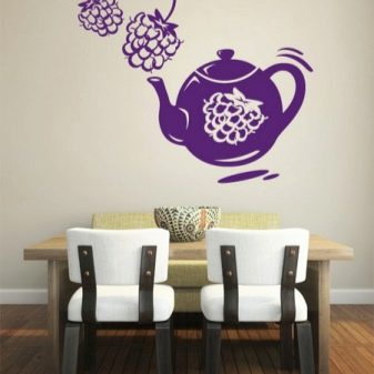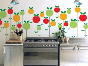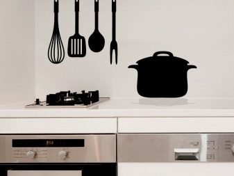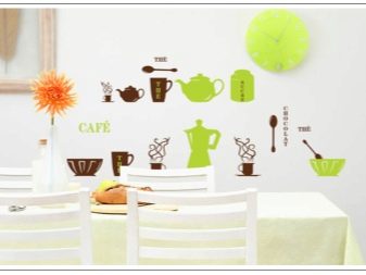 Moderne Vinyl-Aufkleber sind sehr bequem zu bedienen. Ein Qualitätsaufkleber hat keinen Hintergrund (dh einen transparenten Film an der Basis). Sie werden entlang der Kontur mit spezieller Ausrüstung geschnitten: das bedeutet, dass nichts überflüssiges an der Wand sein wird, und das Bild wird wie eine Zeichnung aussehen.Sie können auch Bilder mit einem Hintergrund bestellen, aber in diesem Fall ist es besser, Poster für die Küche zu kaufen - sie sehen nicht weniger originell aus.