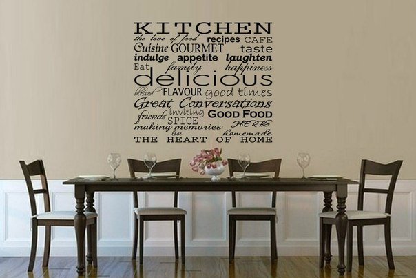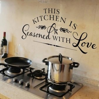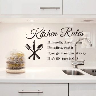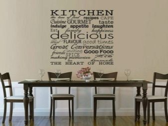 Lieblingsthema für viele Küchenetiketten - die Inschriften. Sie können sowohl in Russisch als auch in anderen Sprachen sein. Wünsche eines guten Appetits, eine Liebeserklärung an Ihr Zuhause und Ihre Küche, oder sogar komische Verhaltensregeln am Kühlschrank - all dies kann auf einen Aufkleber und dann an die Wände gestellt werden: