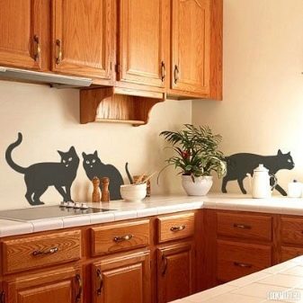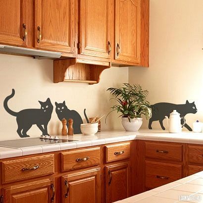 Katzen. Ein anderes "ewiges" Thema. Vor allem sind Katzen die beliebtesten Haustiere und sie verlassen oft nicht die Küche. Zum anderen wirken die geschwungenen und anmutigen Katzen-Silhouetten elegant und humorvoll. Auf Küchenaufklebern können Katzen Mäuse jagen, Fische fangen, Essen aus dem Kühlschrank "stehlen" oder einfach nur "sitzen", während sie auf das Abendessen warten: