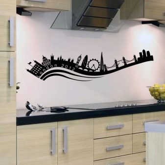 Erfrischen Sie den Innenraum und fügen Sie ein Highlight hinzu und lange horizontale Aufkleber auf der Küchenschürze. Es können florale Muster sein oder beispielsweise Bilder zu urbanen Themen: