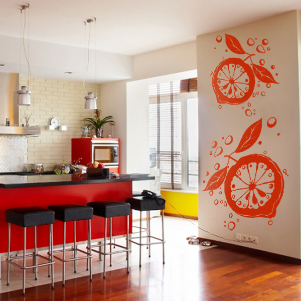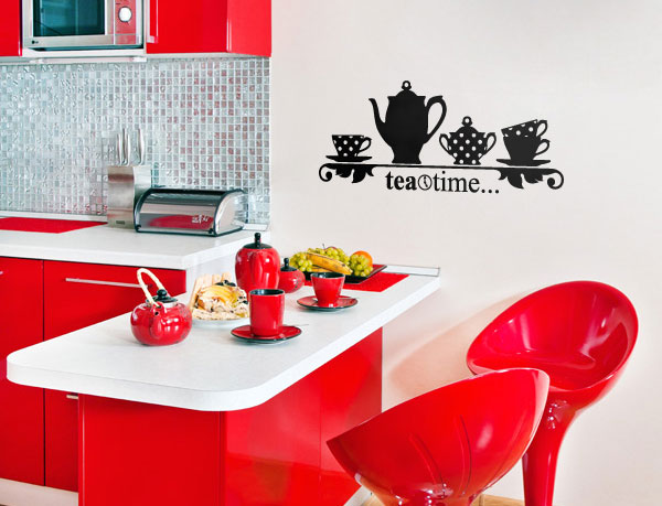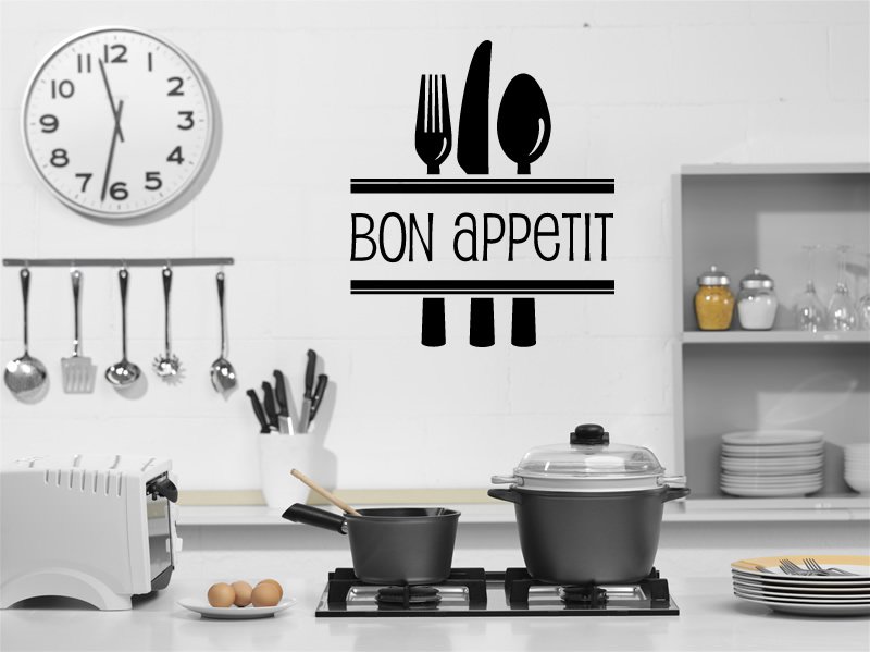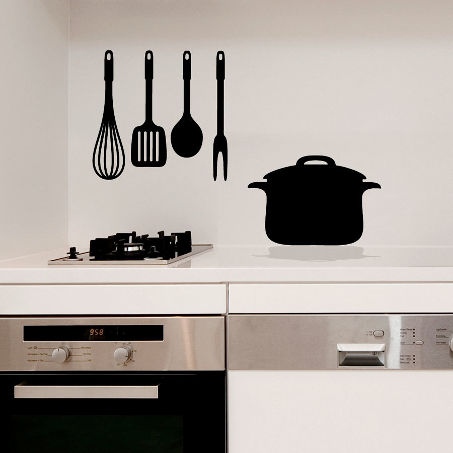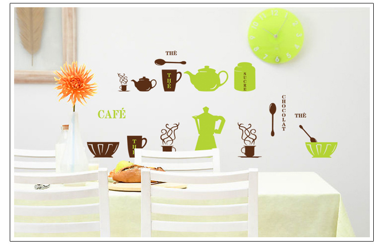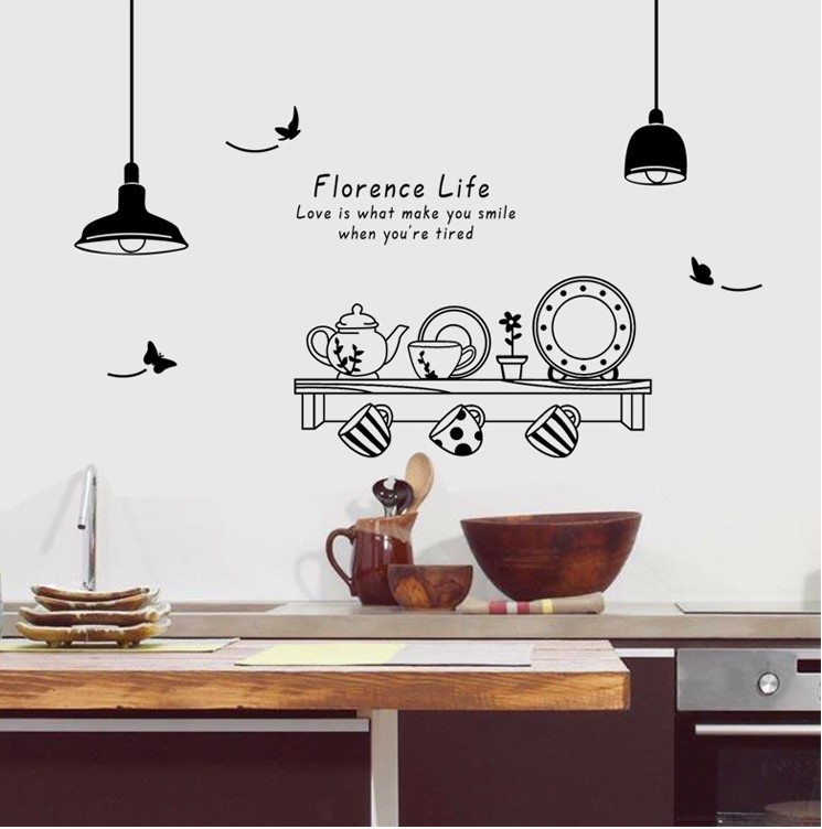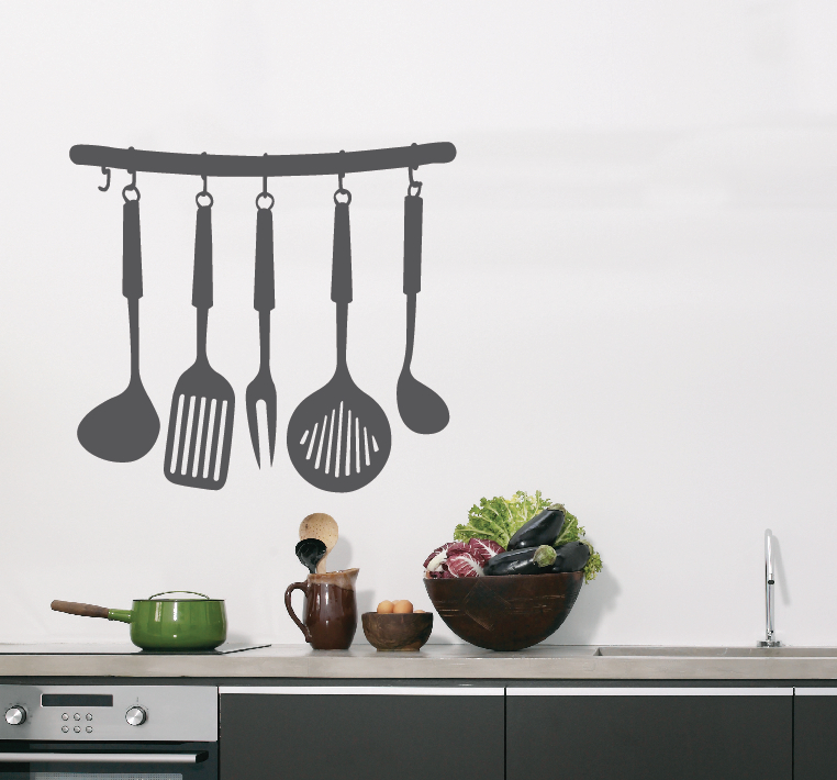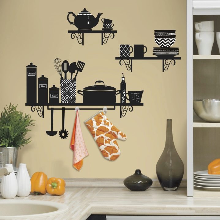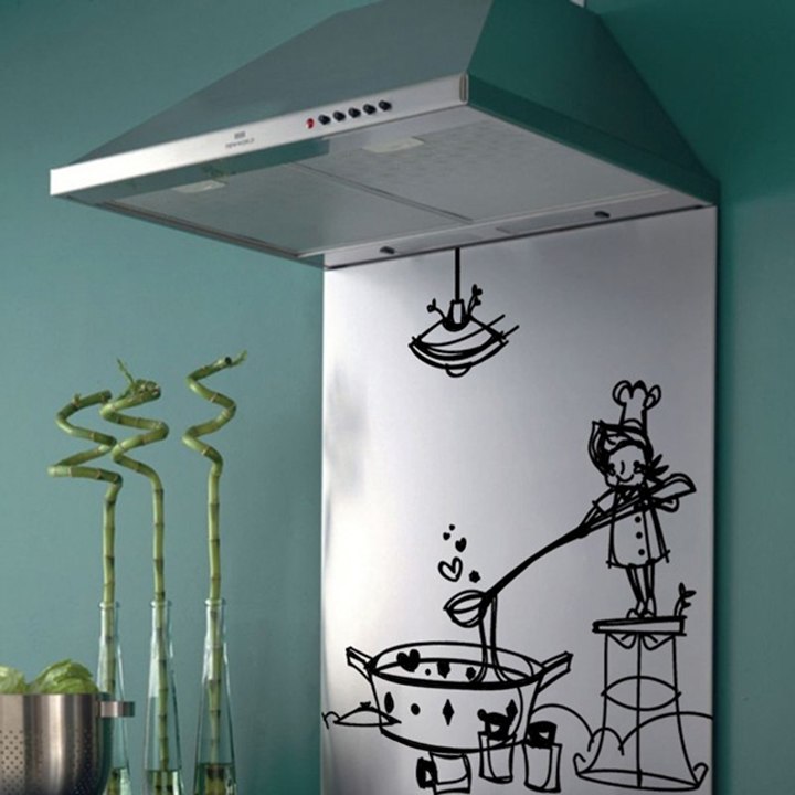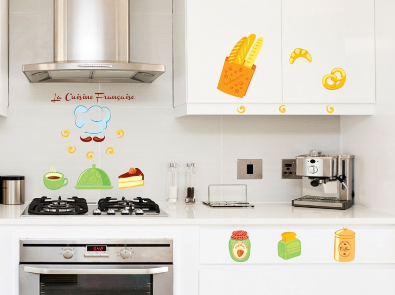 Es sieht sehr witzig in Form eines Aufklebers aus, der eigentlich nicht in der Küche ist. Zum Beispiel eine Uhr oder ein Regal mit Gewürzen und Geschirr an einer leeren Wand:
