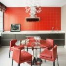 Ein ausgezeichnetes Beispiel, um den Essbereich mit dekorativen Ziegeln zu beenden. Photowall-Papier wird ein Landelement in der Küche vorstellen. Klare Linien des Arbeitsbereichs, weiße Farbe, Beleuchtung harmonieren perfekt mit der gegenüberliegenden strukturierten Wand. Grüne Pflanzen verleihen dem Raum Natürlichkeit.