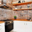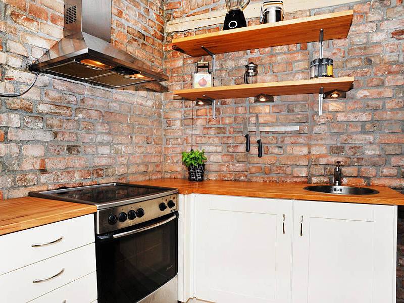 Ziegelstein Wenn Sie von einer Küche im Stil von "Loft" träumen, versuchen Sie, als Wanddekoration, einschließlich einer Schürze, Ziegel zu verwenden. Es kann ein dekorativer oder natürlicher Ziegelstein sein, der auf eine spezielle Weise behandelt wird. Strukturiertes Material in perfekter Harmonie mit den Möbeln mit Metallelementen. Es ist feuerfest, verschleißfest.