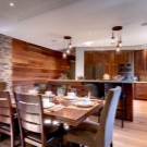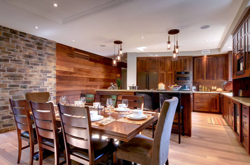 Die Kombination aus dunklem Holz und hellen Möbeln, die Aufteilung der Trennwände in zwei horizontale Teile - eine interessante Option Dekor. Der untere Teil ist mit Holz oder Plastik getrimmt und die obere Tapete zum Bemalen. Diese Version ähnelt dem englischen Stil. Die Küchentrennwand kann auch mit MDF oder Glas behandelt werden.