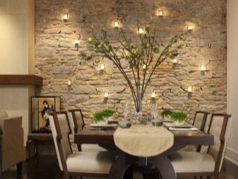 Platten unter dem Stein. Nicht-Standard, aber originelle Lösung - das Design der Wände mit dekorativen oder Naturstein. Dieses Material schafft eine spektakuläre Küche. Die Platten imitieren natürlich die Oberfläche des Steins, sie sind ganz einfach aufgelegt. Es ist einfach, die Wand mit solchen Platten zu beenden, aber bestimmte Fähigkeiten werden benötigt.
