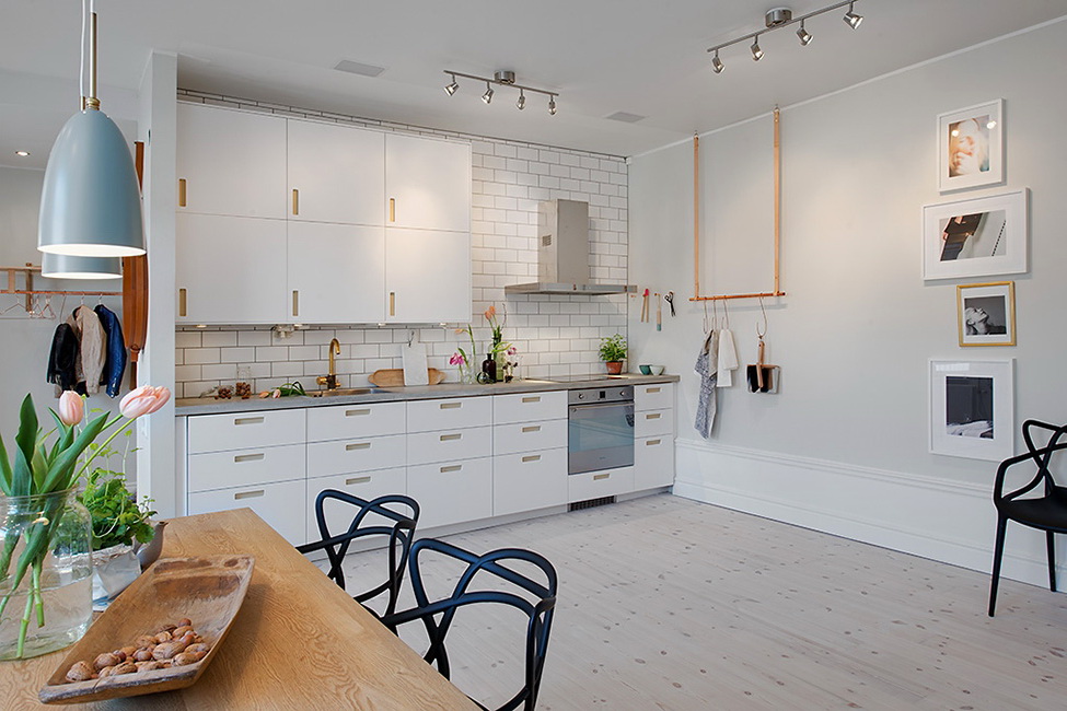 Der umweltfreundlichste Stil von heute ist skandinavisch. Die Wände im skandinavischen Stil sind mit einer Diele verkleidet. Den Designern wird jedoch empfohlen, eine abschließende Kontrastoption zu wählen, da die Küche sonst in eine Box verwandelt werden kann.