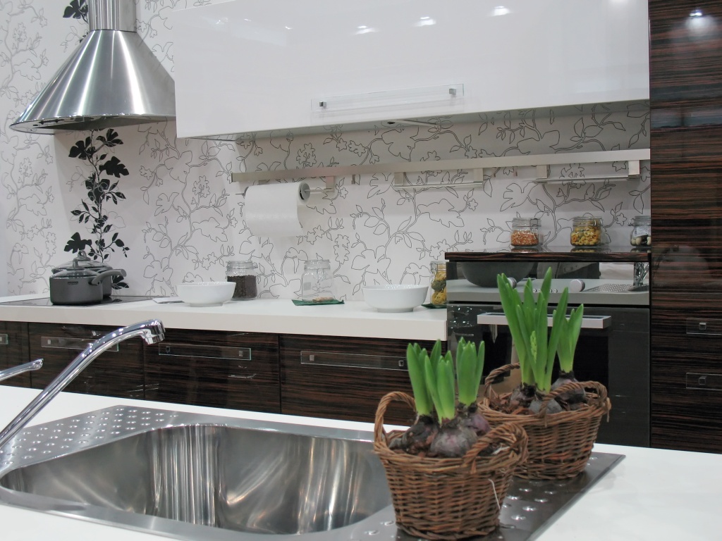 Weiße Möbel in der Küche sind ein moderner Trend. Es ist perfekt mit schneeweißen Möbeln mit kontrastierenden Wänden kombiniert. Zum Beispiel, Tapeten mit floralen Mustern sehen organisch aus und geben ein Gefühl von Komfort.