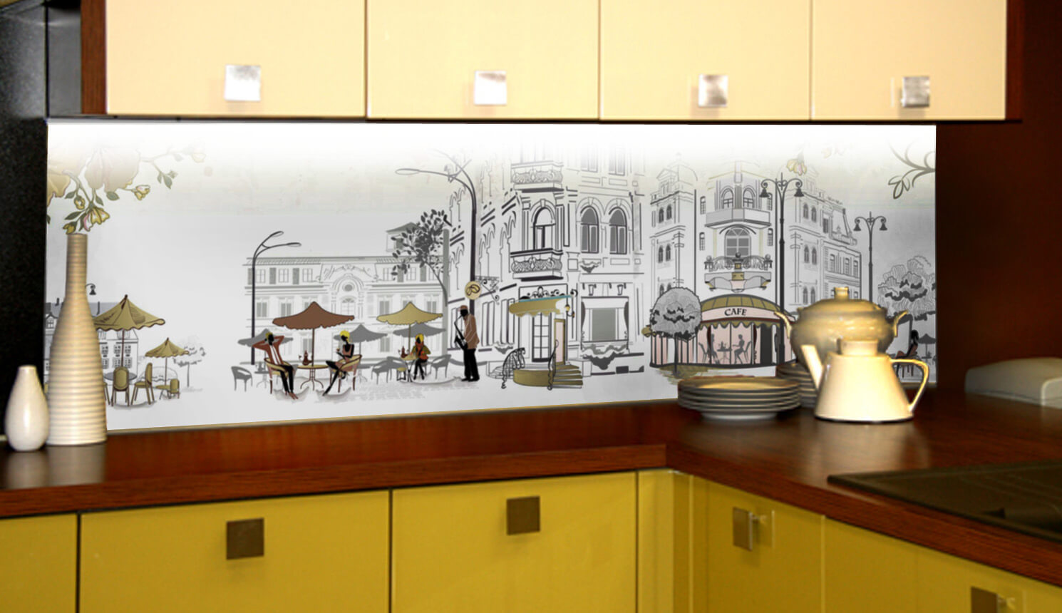 Glasscheiben. Eine seltene und ungewöhnliche Art, die Wände in der Küche zu beenden. Solche Paneele können zur Bearbeitung als Arbeitsbereich und zum Speisen verwendet werden. Dieses Material ist schön und widerstandsfähig. Glas kann interessant sein, um es zu dekorieren, ziehe es eine Zeichnung, ein Muster oder ein Foto an. Dies bedeutet, dass die Küche Exklusivität erhält.