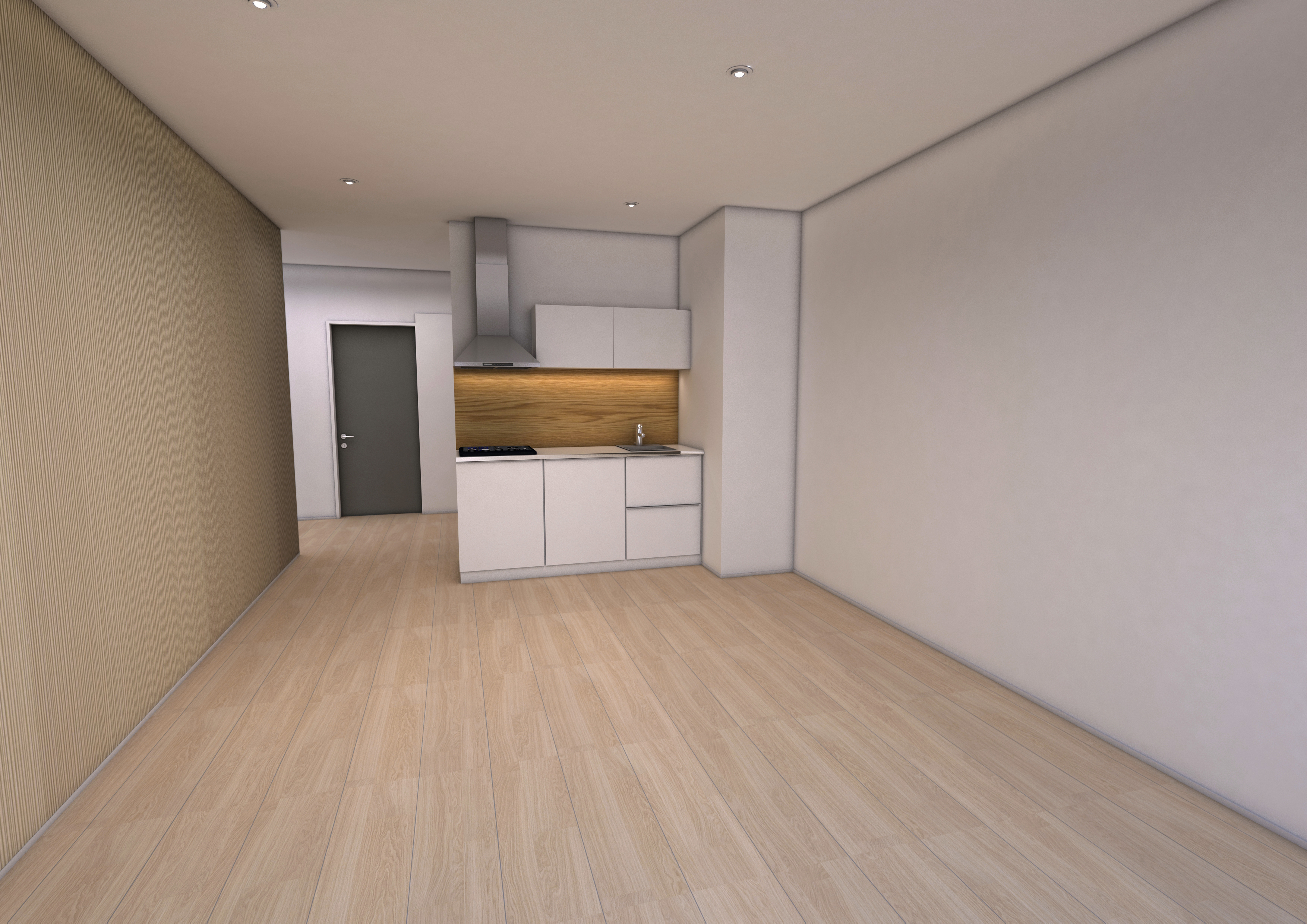 Braunes Parkett, strukturierter Holztisch, weißer Arbeitsbereich im Minimalismus-Stil, Marmorplatten, die in der Kochzone mit einer Wand versehen sind, bringen Luxus und Gemütlichkeit in den Küchenraum.