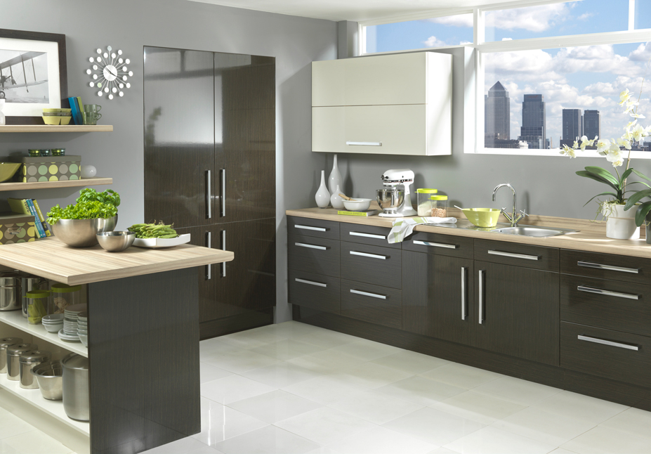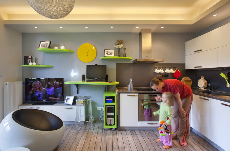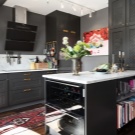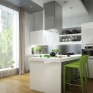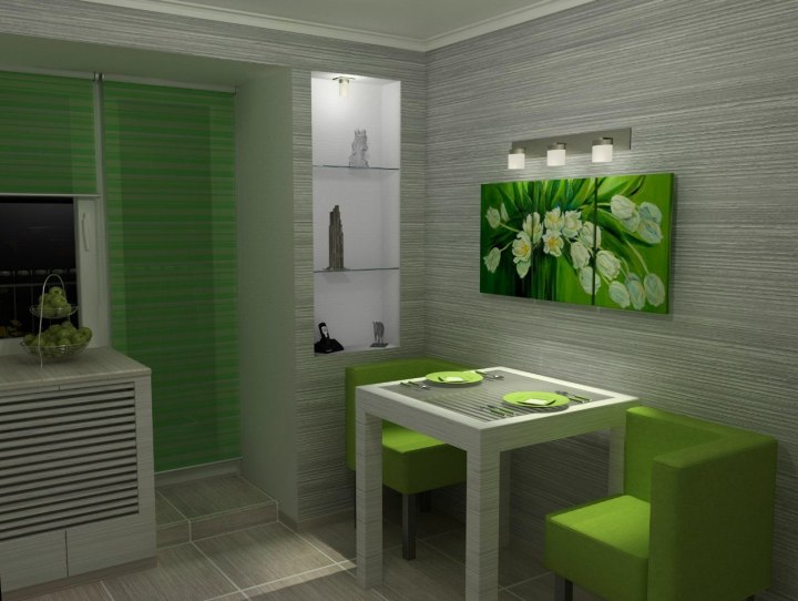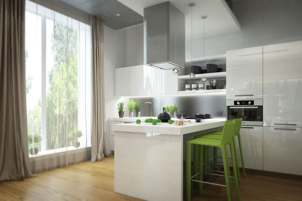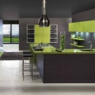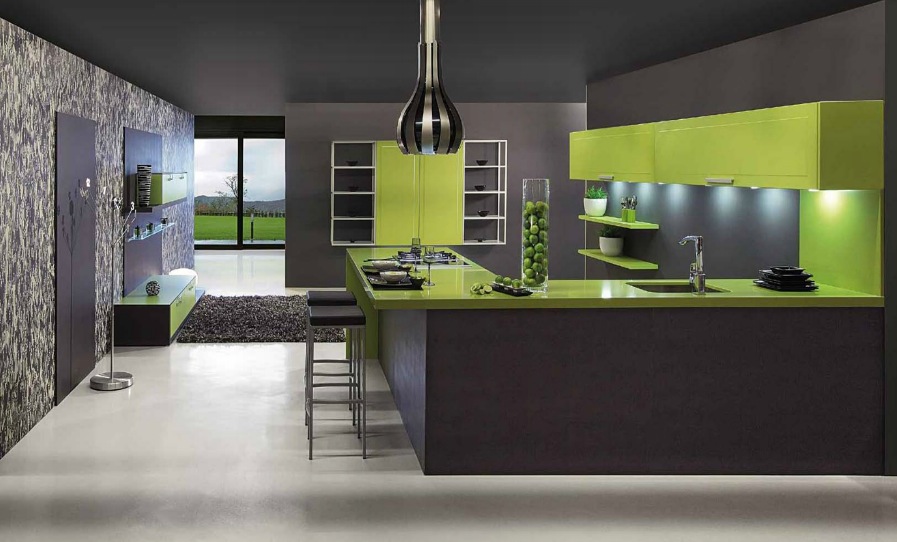 Grün. Das beruhigende Innere der Küche dieser Farben führt zu Frieden. Die grünen Fassaden der Küche werden das Interieur auffrischen. Sie werden den Öko-Stil perfekt unterstützen, wo die dunkelgrauen Wände die Erde und die grünen Headsets - Gras und Laub - symbolisieren werden.